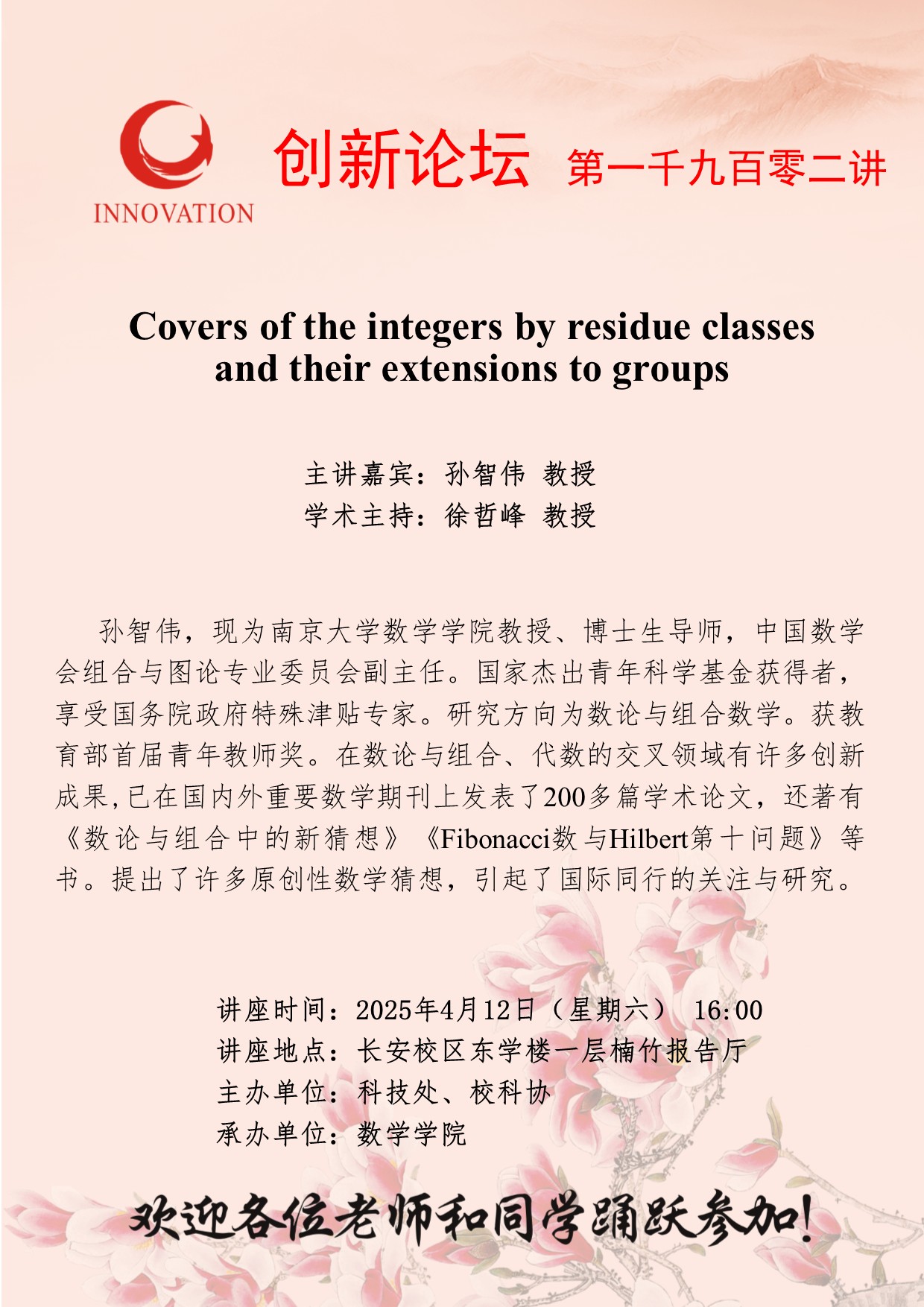 孙智伟 教授 古天乐代言太阳集团城网址创新论坛第一千九百零二讲:Covers of the integers by residue classes and their extensions to groups 讲座时间 2025年4月12日(星期六) 16:00 讲座地点 长安校区东学楼一层楠竹报告厅 讲座人介绍 孙智伟 教授 讲座内容