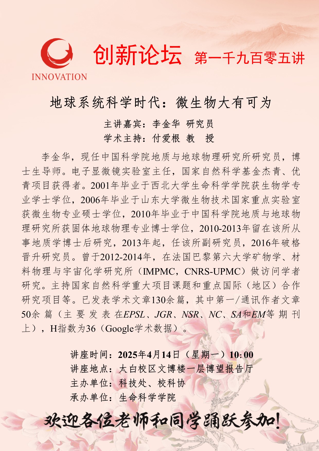李金华 研究员 古天乐代言太阳集团城网址创新论坛第一千九百零五讲:地球系统科学时代:微生物大有可为 讲座时间 2025年4月14日(星期一)10:00 讲座地点 太白校区文博楼一层博望报告厅 讲座人介绍 李金华 研究员 讲座内容