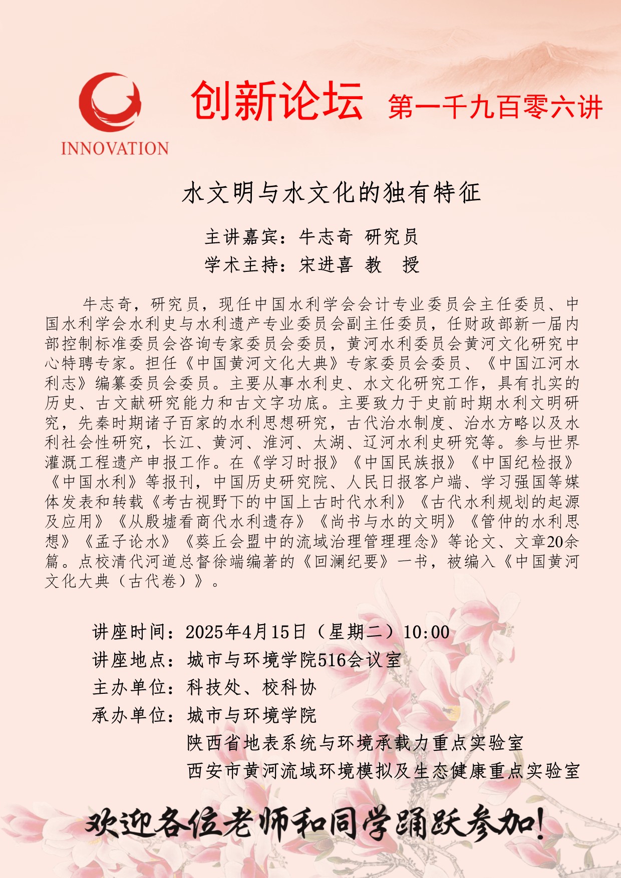 牛志奇 研究员 古天乐代言太阳集团城网址创新论坛第一千九百零六讲:水文明与水文化的独有特征 讲座时间 2025年4月15日(星期二)10:00 讲座地点 城市与环境学院516会议室 讲座人介绍 牛志奇 研究员 讲座内容