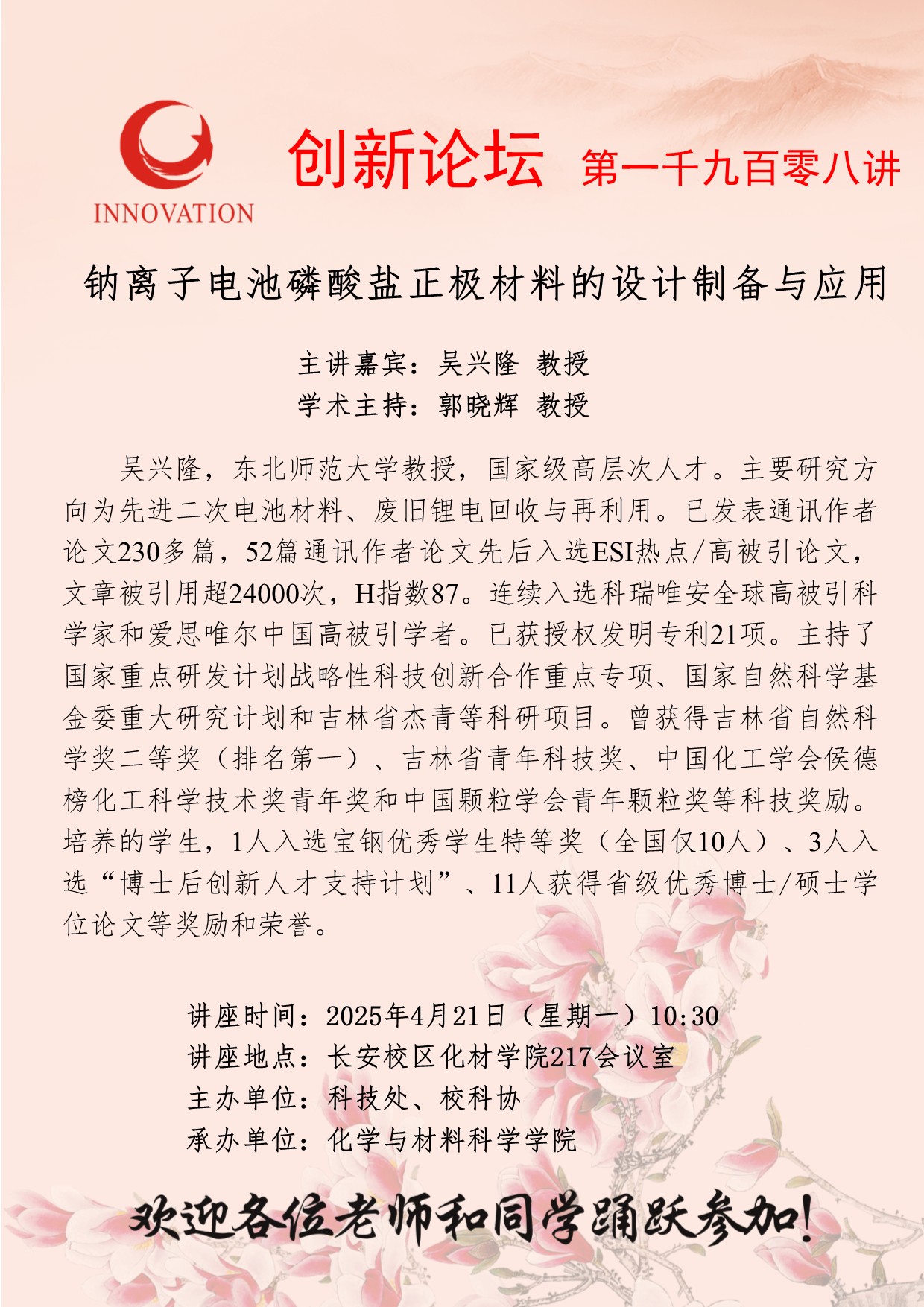 吴兴隆 教授 古天乐代言太阳集团城网址创新论坛第一千九百零八讲:钠离子电池磷酸盐正极材料的设计制备与应用 讲座时间 2025年4月21日(星期一)10:30 讲座地点 长安校区化材学院217会议室 讲座人介绍 吴兴隆 教授 讲座内容