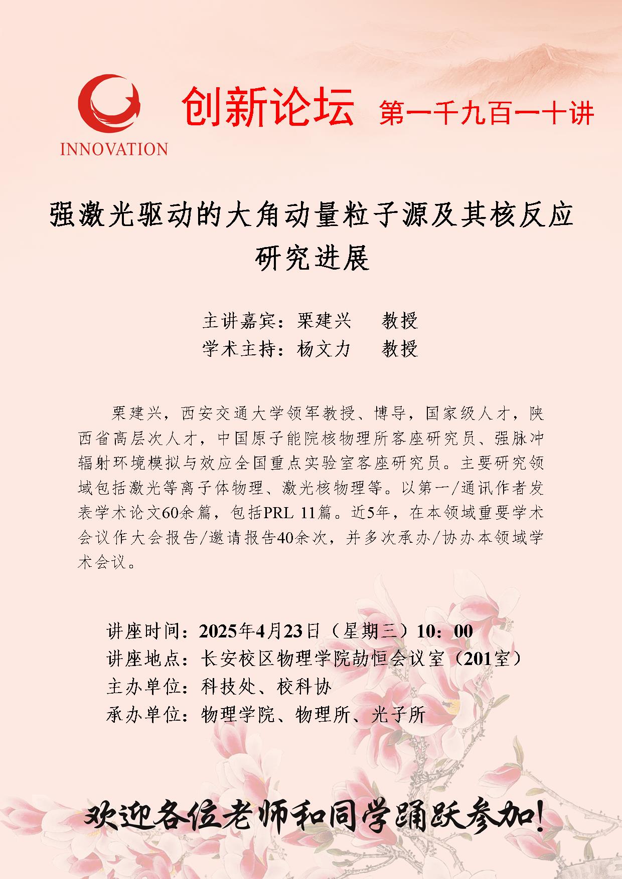 栗建兴 教授 古天乐代言太阳集团城网址创新论坛第一千九百一十讲:强激光驱动的大角动量粒子源及其核反应研究进展 讲座时间 2025年4月23日(星期三)10:00 讲座地点 长安校区物理学院劼恒会议室(201室) 讲座人介绍 栗建兴 教授 讲座内容