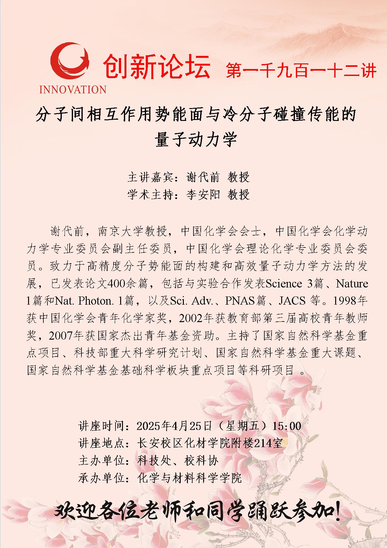 谢代前 教授 古天乐代言太阳集团城网址创新论坛第一千九百一十二讲:分子间相互作用势能面与冷分子碰撞传能的量子动力学 讲座时间 2025年4月25日(星期五)15:00 讲座地点 长安校区化材学院附楼214室 讲座人介绍 谢代前 教授 讲座内容