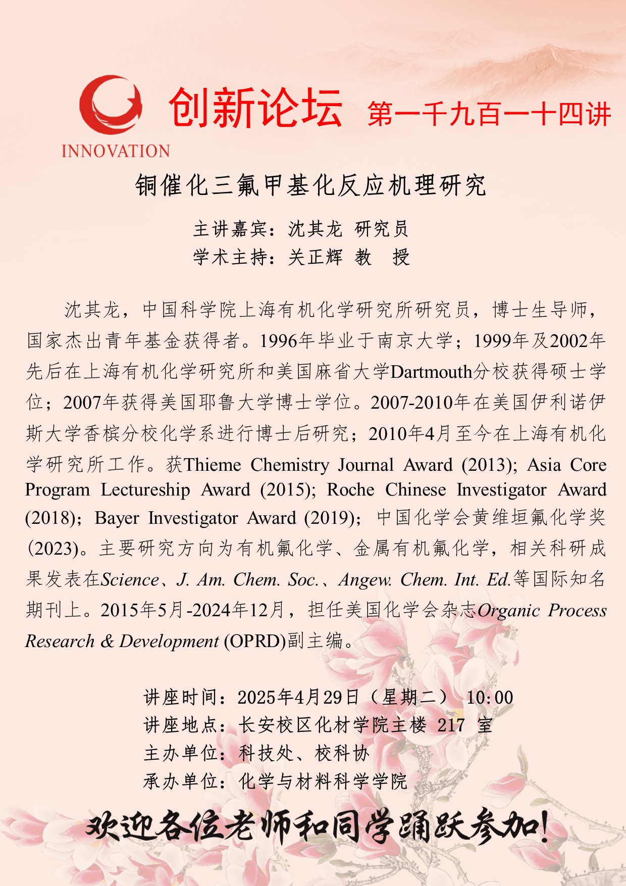 沈其龙 研究员 古天乐代言太阳集团城网址创新论坛第一千九百一十四讲:铜催化三氟甲基化反应机理研究 讲座时间 2025年4月29日(星期二) 10:00 讲座地点 长安校区化材学院主楼 217 室 讲座人介绍 沈其龙 研究员 讲座内容