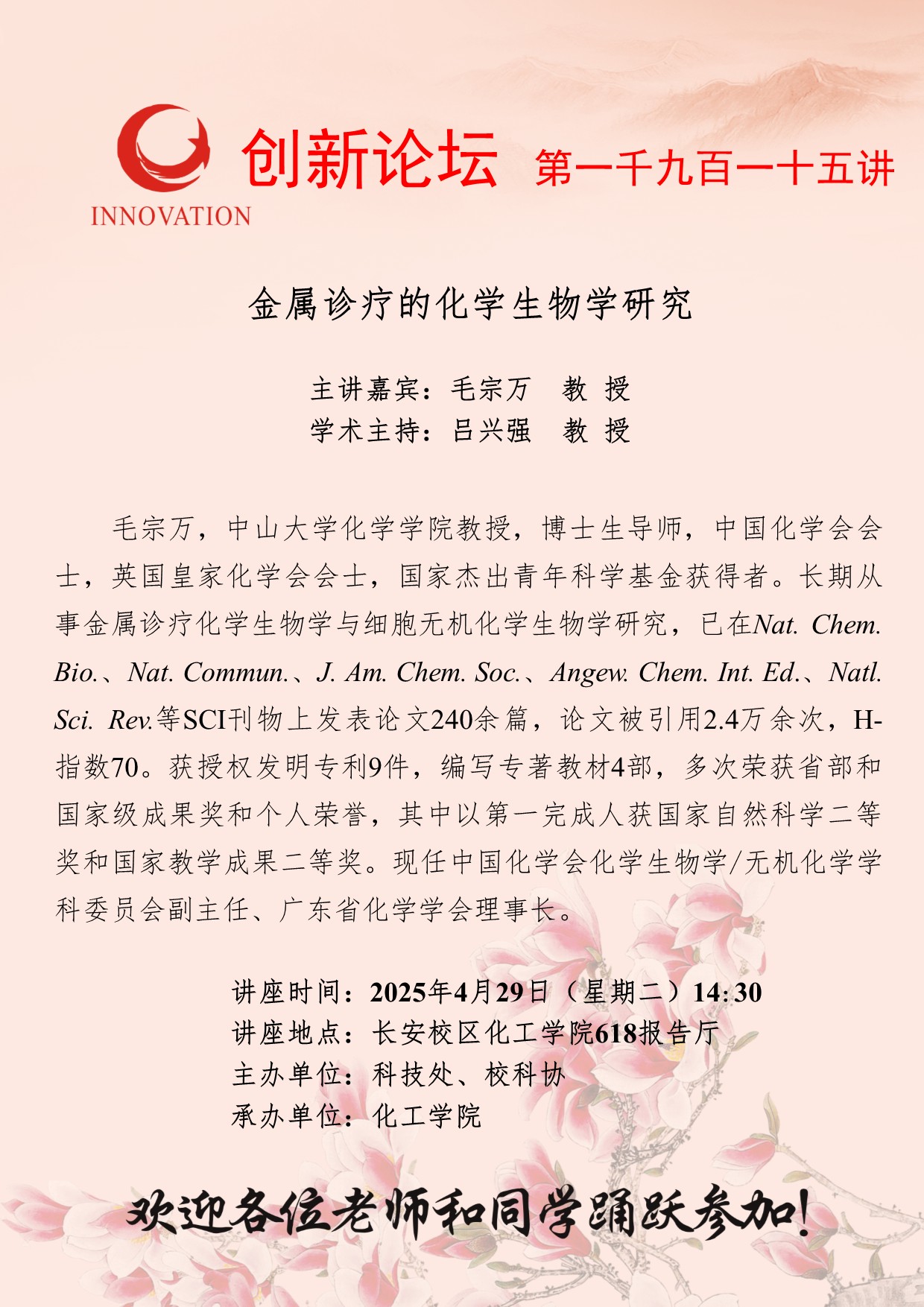 毛宗万 教授 古天乐代言太阳集团城网址创新论坛第一千九百一十五讲:金属诊疗的化学生物学研究 讲座时间 2025年4月29日(星期二)14:30 讲座地点 长安校区化工学院618报告厅 讲座人介绍 毛宗万 教授 讲座内容