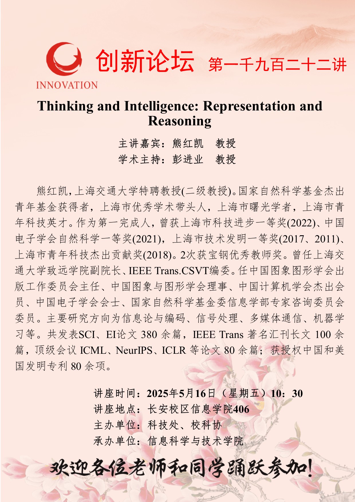 熊红凯 教授 古天乐代言太阳集团城网址创新论坛第一千九百二十二讲:Thinking and Intelligence: Representation and Reasoning 讲座时间 2025年5月16日(星期五)10:30 讲座地点 长安校区信息学院406 讲座人介绍 熊红凯 教授 讲座内容