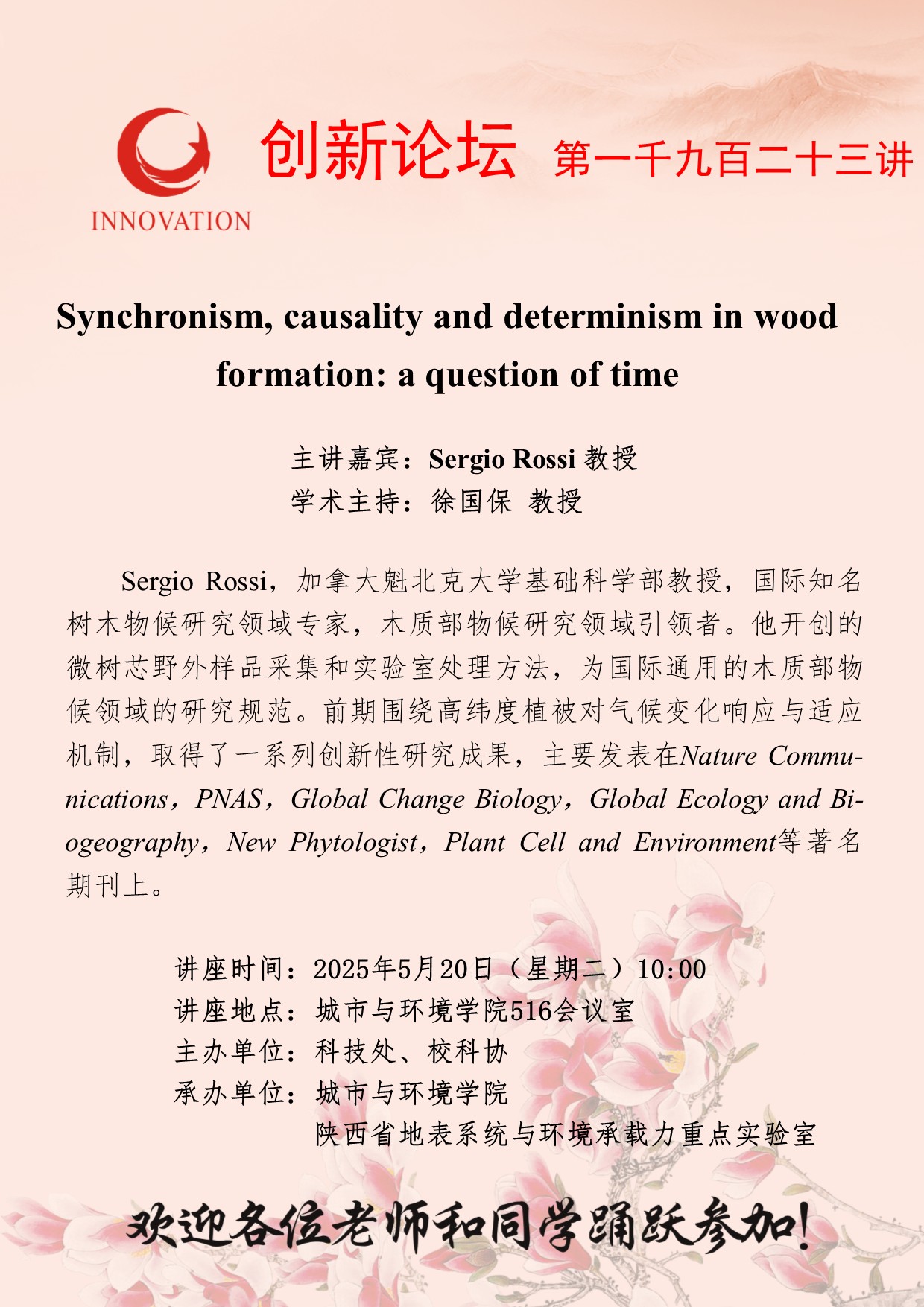 Sergio Rossi 教授 古天乐代言太阳集团城网址创新论坛第一千九百二十三讲:Synchronism, causality and determinism in wood formation: a question of time 讲座时间 2025年5月20日(星期二)10:00 讲座地点 城市与环境学院516会议室 讲座人介绍 Sergio Rossi 教授 讲座内容