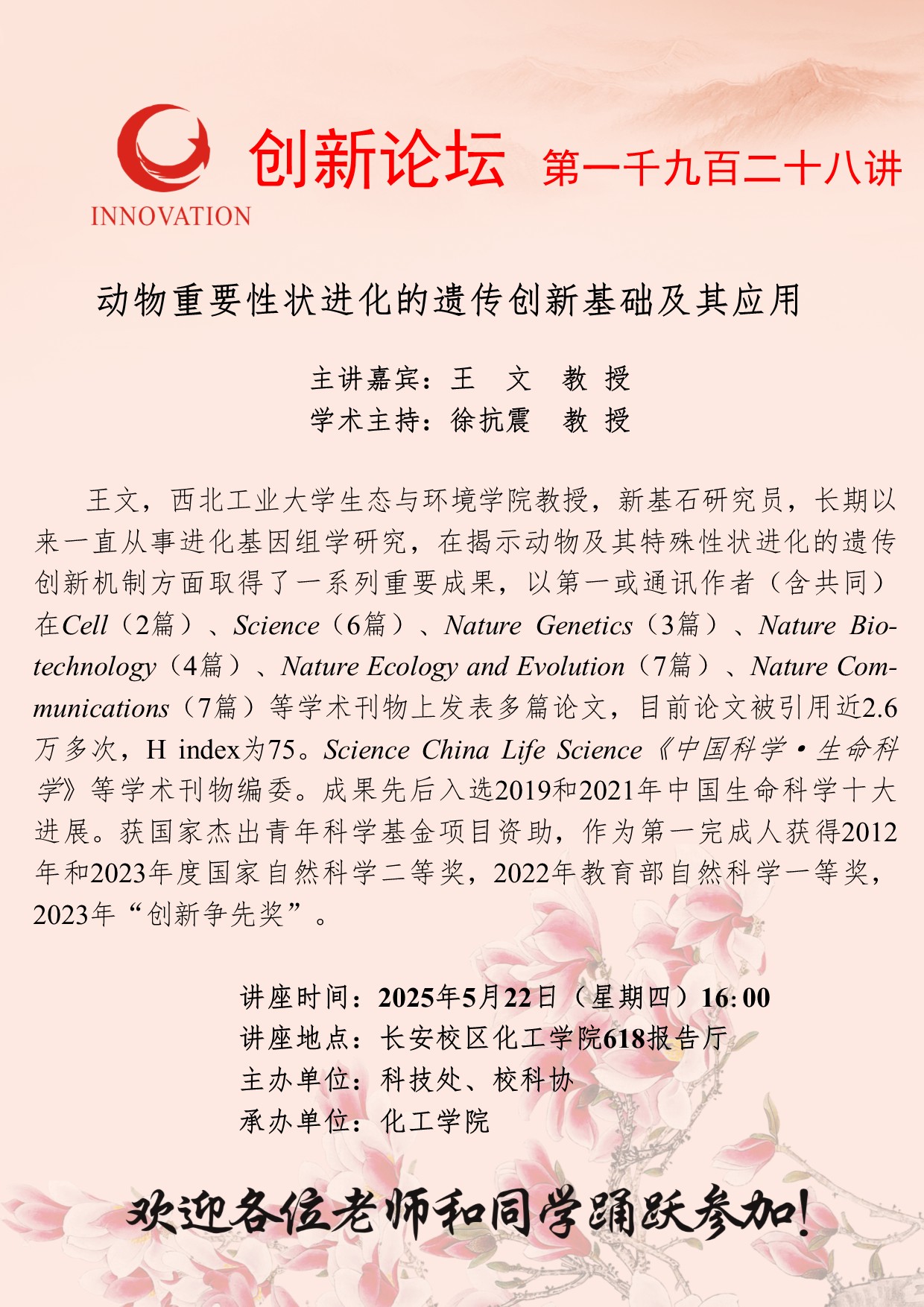 王文 教授 古天乐代言太阳集团城网址创新论坛第一千九百二十八讲:动物重要性状进化的遗传创新基础及其应用 讲座时间 2025年5月22日(星期四)16:00 讲座地点 长安校区化工学院618报告厅 讲座人介绍 王文 教授 讲座内容