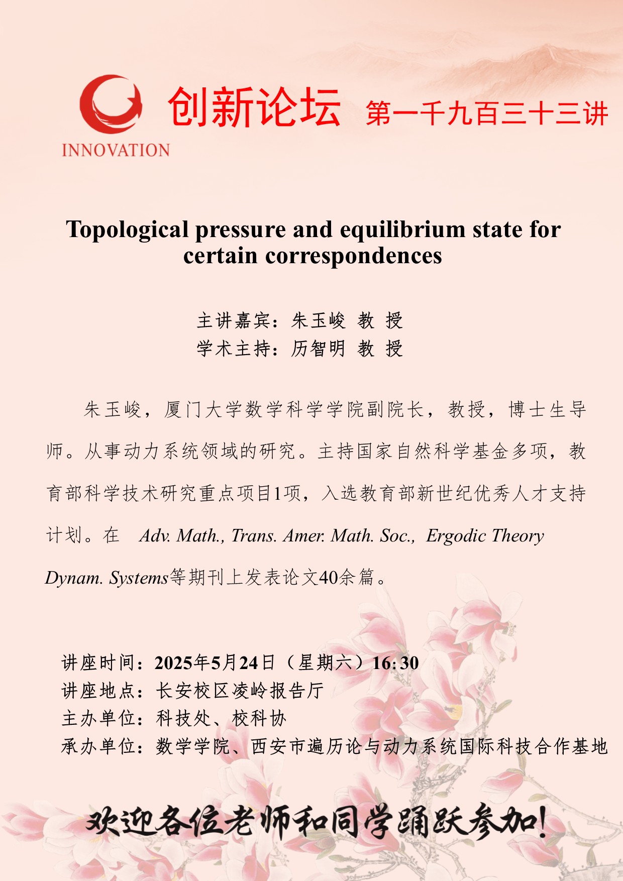 朱玉峻 教授 古天乐代言太阳集团城网址创新论坛第一千九百三十三讲:Topological pressure and equilibrium state for certain correspondences 讲座时间 2025年5月24日(星期六)16:30 讲座地点 长安校区凌岭报告厅 讲座人介绍 朱玉峻 教授 讲座内容