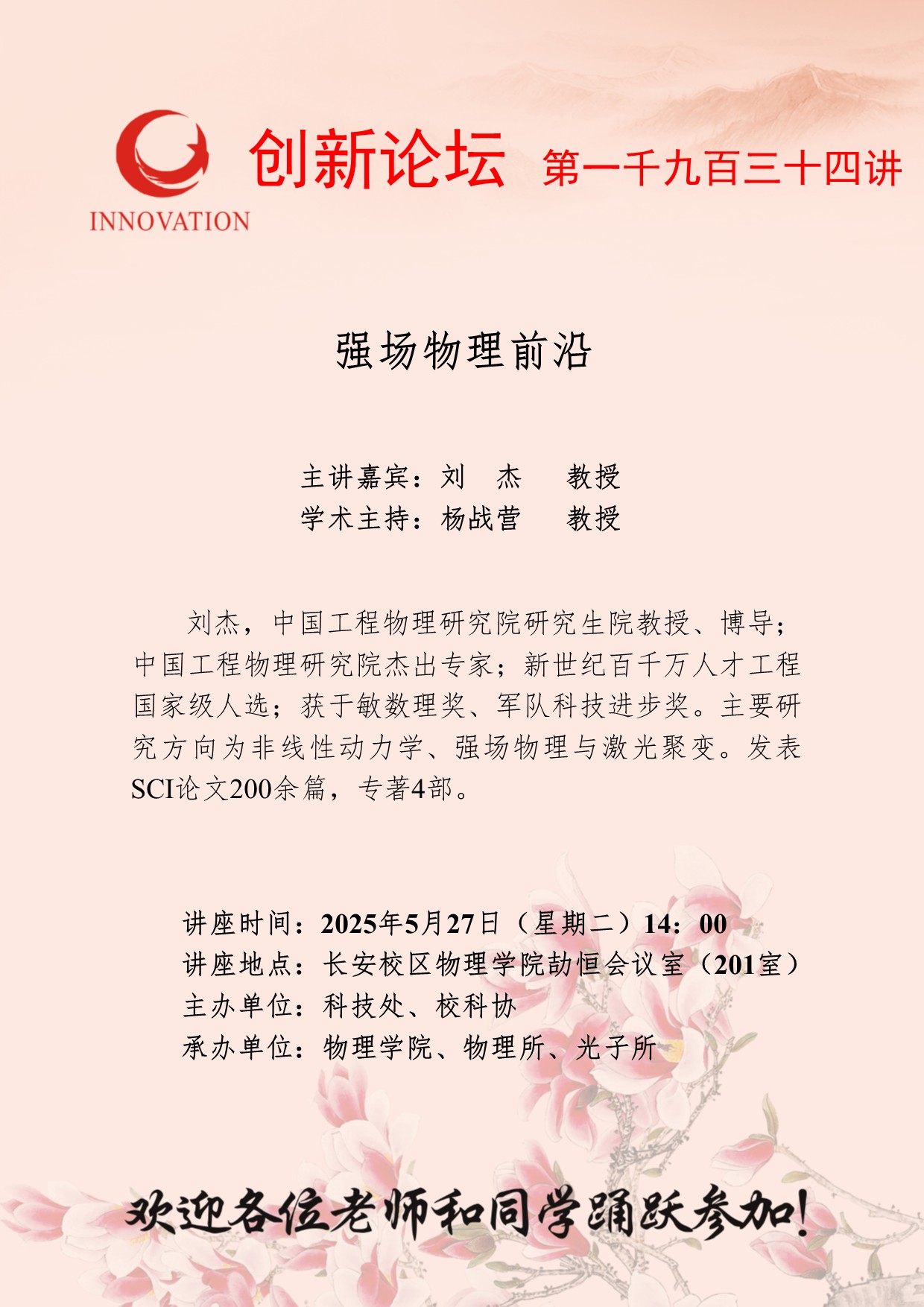 刘杰 教授 古天乐代言太阳集团城网址创新论坛第一千九百三十四讲:强场物理前沿 讲座时间 2025年5月27日(星期二)14:00 讲座地点 长安校区物理学院劼恒会议室(201室) 讲座人介绍 刘杰 教授 讲座内容