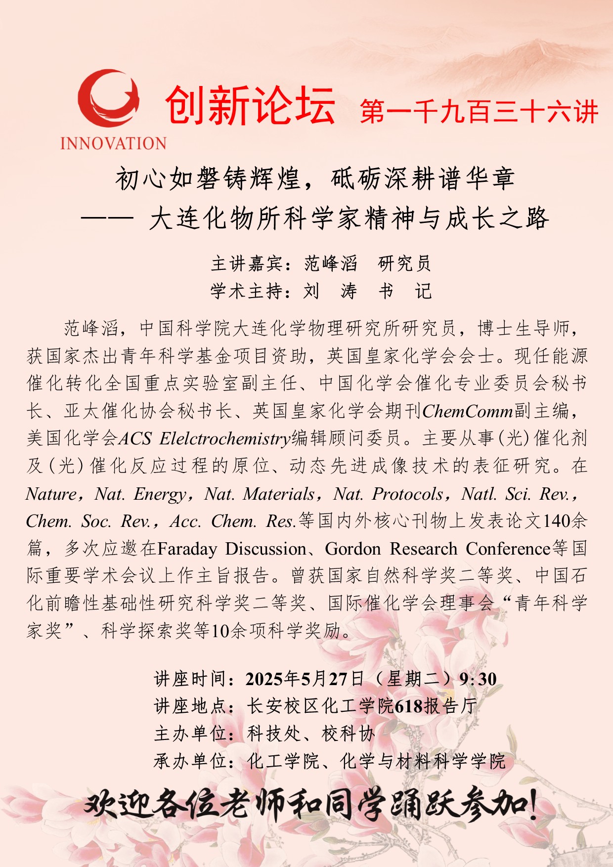 范峰滔 研究员 古天乐代言太阳集团城网址创新论坛第一千九百三十六讲:初心如磐铸辉煌,砥砺深耕谱华章——大连化物所科学家精神与成长之路 讲座时间 2025年5月27日(星期二)9:30 讲座地点 长安校区化工学院618报告厅 讲座人介绍 范峰滔 研究员 讲座内容