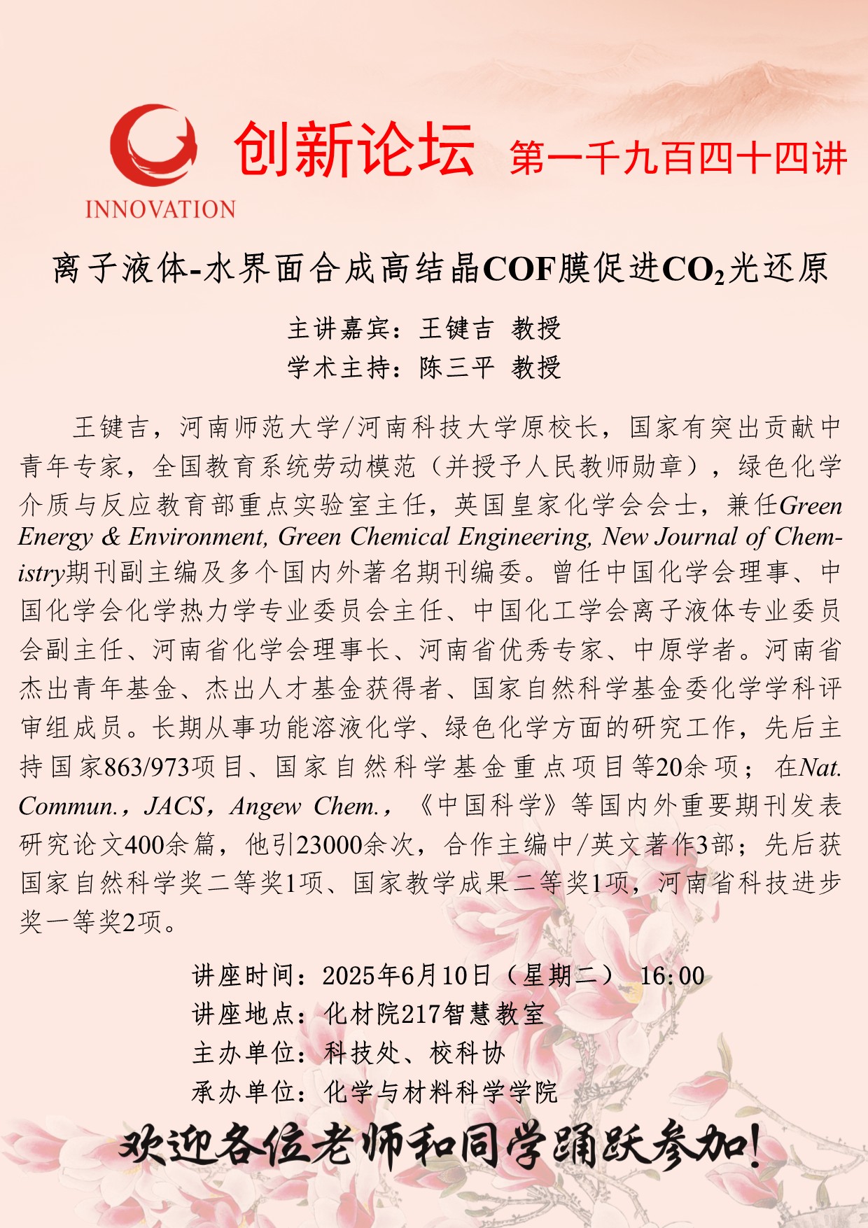 王键吉 教授 古天乐代言太阳集团城网址创新论坛第一千九百四十四讲:离子液体-水界面合成高结晶COF膜促进CO2光还原 讲座时间 2025年6月10日(星期二) 16:00 讲座地点 化材院217智慧教室 讲座人介绍 王键吉 教授 讲座内容