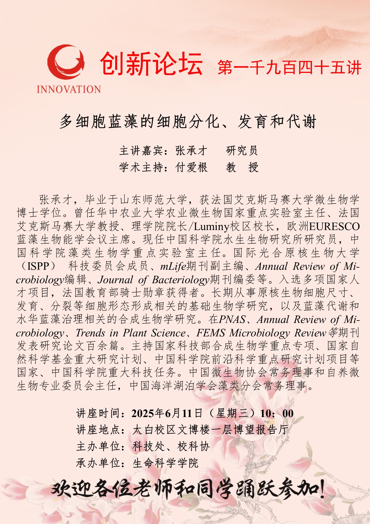 张承才 研究员 古天乐代言太阳集团城网址创新论坛第一千九百四十五讲:多细胞蓝藻的细胞分化、发育和代谢 讲座时间 2025年6月11日(星期三)10:00 讲座地点 太白校区文博楼一层博望报告厅 讲座人介绍 张承才 研究员 讲座内容