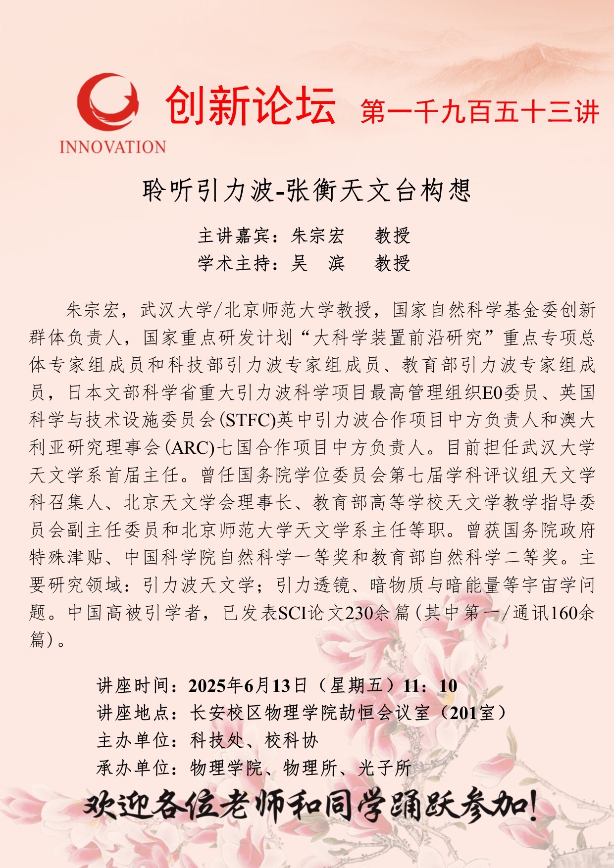 朱宗宏 教授 古天乐代言太阳集团城网址创新论坛第一千九百五十三讲:聆听引力波-张衡天文台构想 讲座时间 2025年6月13日(星期五)11:10 讲座地点 长安校区物理学院劼恒会议室(201室) 讲座人介绍 朱宗宏 教授 讲座内容