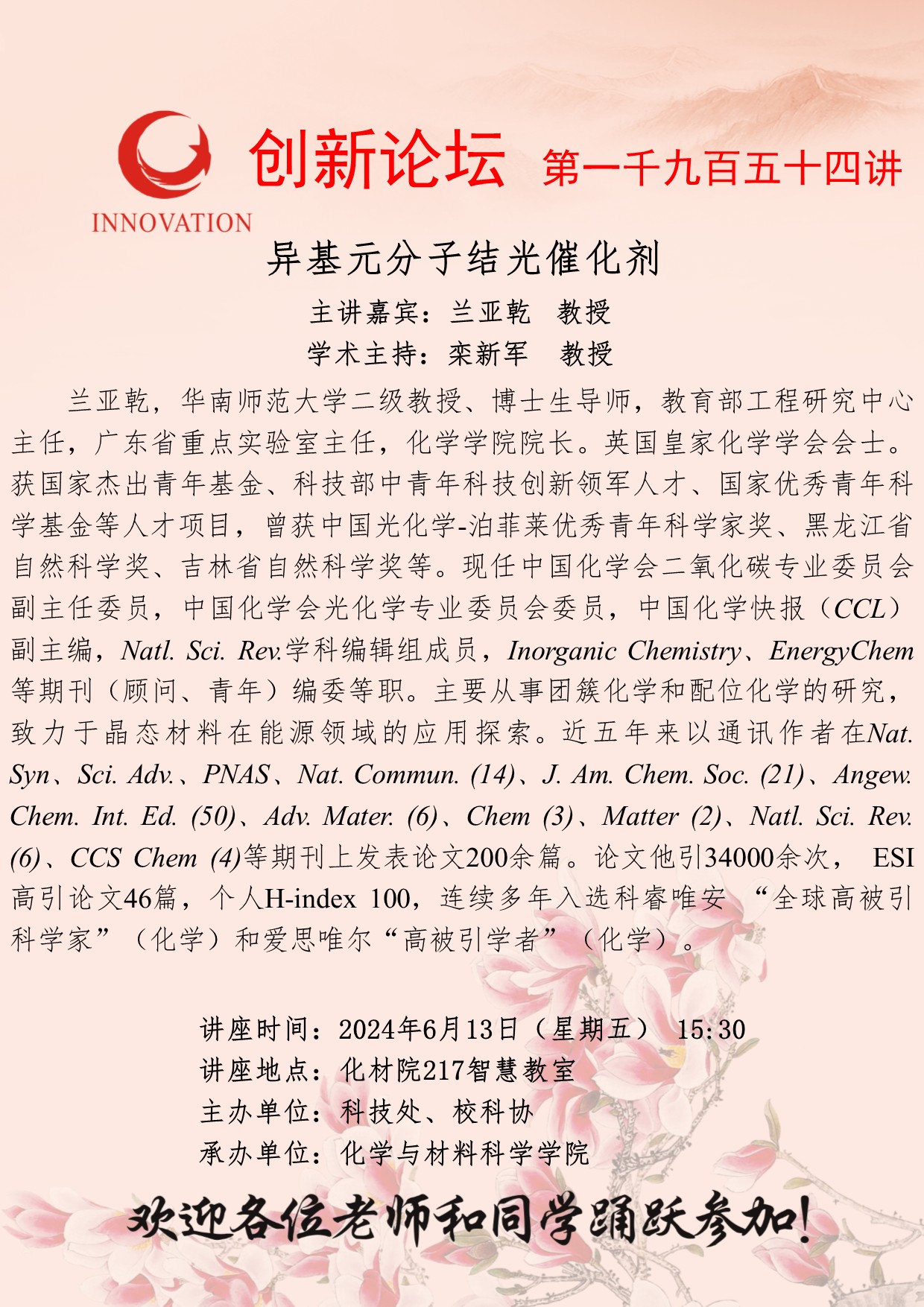 兰亚乾 教授 古天乐代言太阳集团城网址创新论坛第一千九百五十四讲:异基元分子结光催化剂 讲座时间 2024年6月13日(星期五) 15:30 讲座地点 化材院217智慧教室 讲座人介绍 兰亚乾 教授 讲座内容