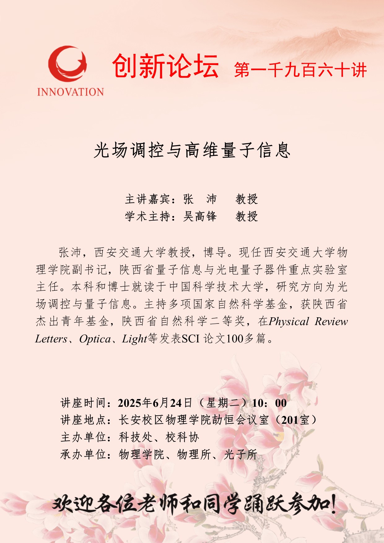 张沛 教授 古天乐代言太阳集团城网址创新论坛第一千九百六十讲:光场调控与高维量子信息 讲座时间 2025年6月24日(星期二)10:00 讲座地点 长安校区物理学院劼恒会议室(201室) 讲座人介绍 张沛 教授 讲座内容