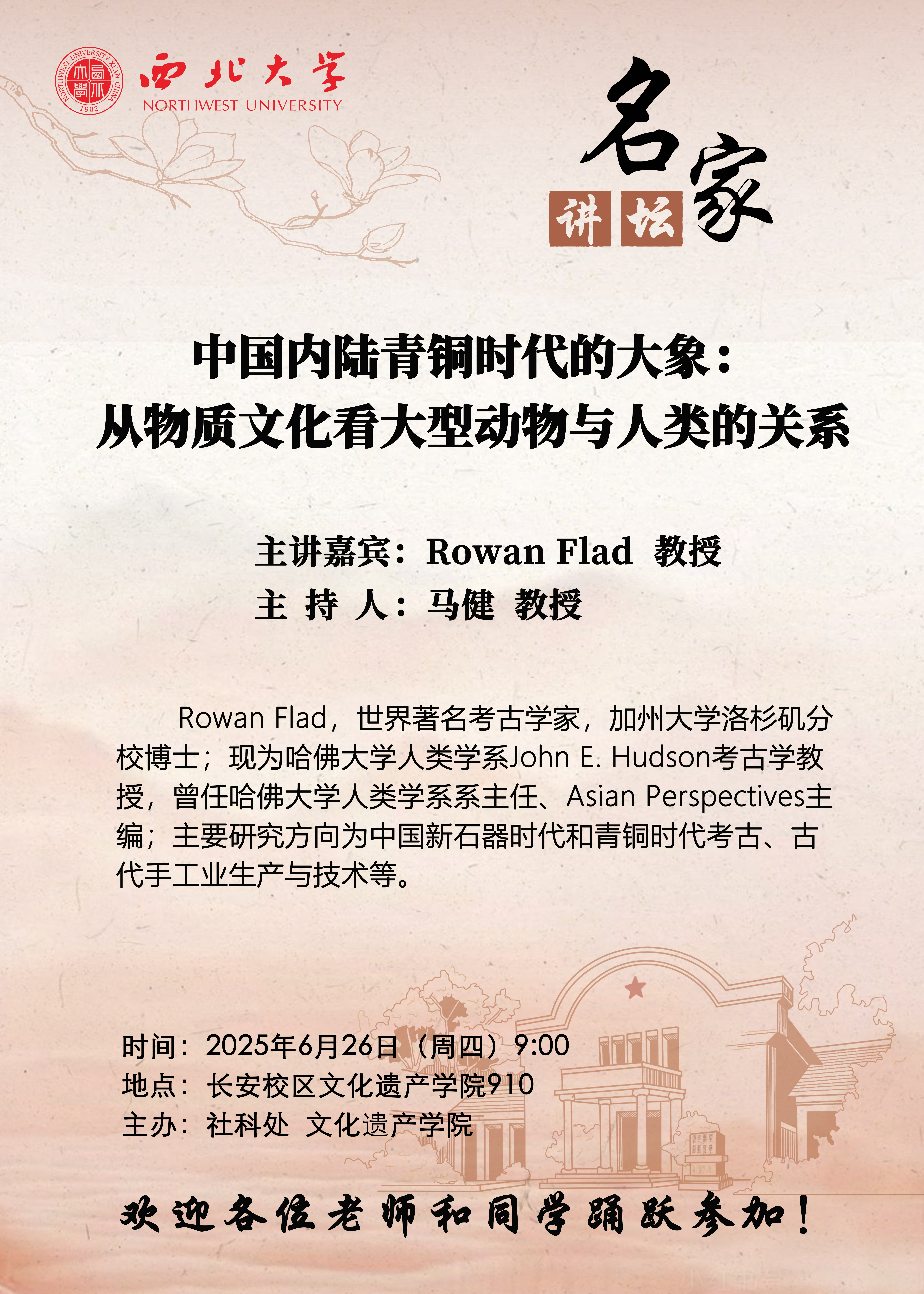 Rowan Flad 教授 名家讲坛:中国内陆青铜时代的大象:从物质文化看大型动物与人类的关系 讲座时间 2025年6月26日周四9:00 讲座地点 长安校区文化遗产学院910 讲座人介绍 Rowan Flad 教授 讲座内容