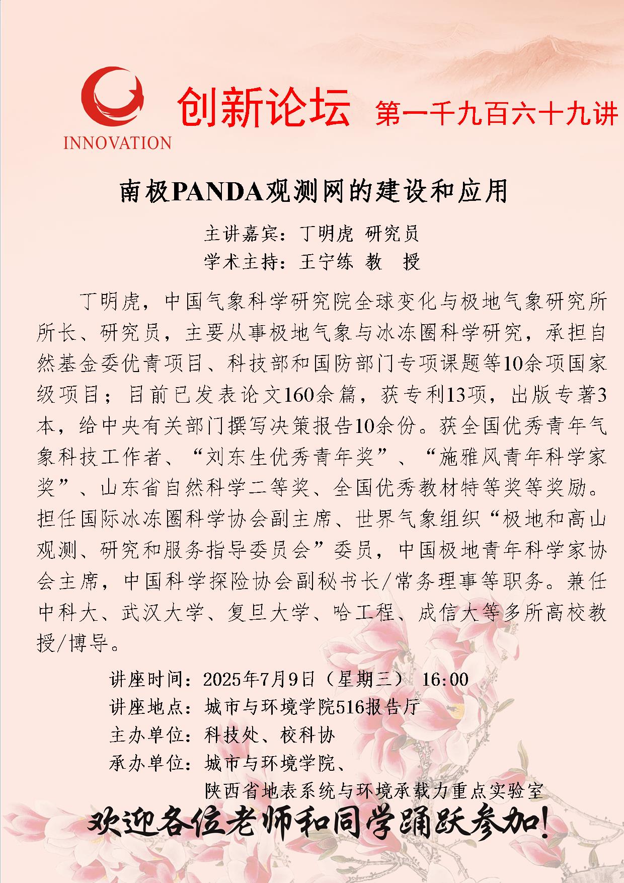 丁明虎 研究员 古天乐代言太阳集团城网址创新论坛第一千九百六十九讲:南极PANDA观测网的建设和应用 讲座时间 2025年7月9日(星期三) 16:00 讲座地点 城市与环境学院516报告厅 讲座人介绍 丁明虎 研究员 讲座内容