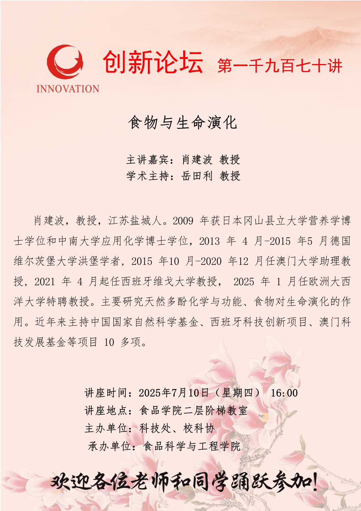 肖建波 教授 古天乐代言太阳集团城网址创新论坛第一千九百七十讲: 食物与生命演化 讲座时间 2025年7月10日(星期四) 16:00 讲座地点 食品学院二层阶梯教室 讲座人介绍 肖建波 教授 讲座内容