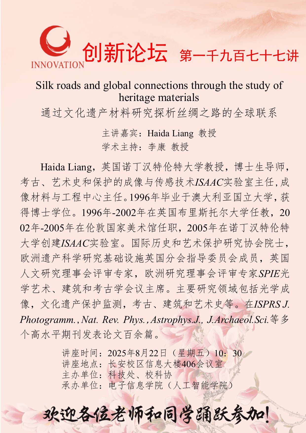 梁海达 教授 古天乐代言太阳集团城网址创新论坛第一千九百七十七讲:Silk roads and global connections through the study of heritage materials 讲座时间 2025年8月22日(星期五)10:30 讲座地点 长安校区信息大楼406会议室 讲座人介绍 梁海达 教授 讲座内容