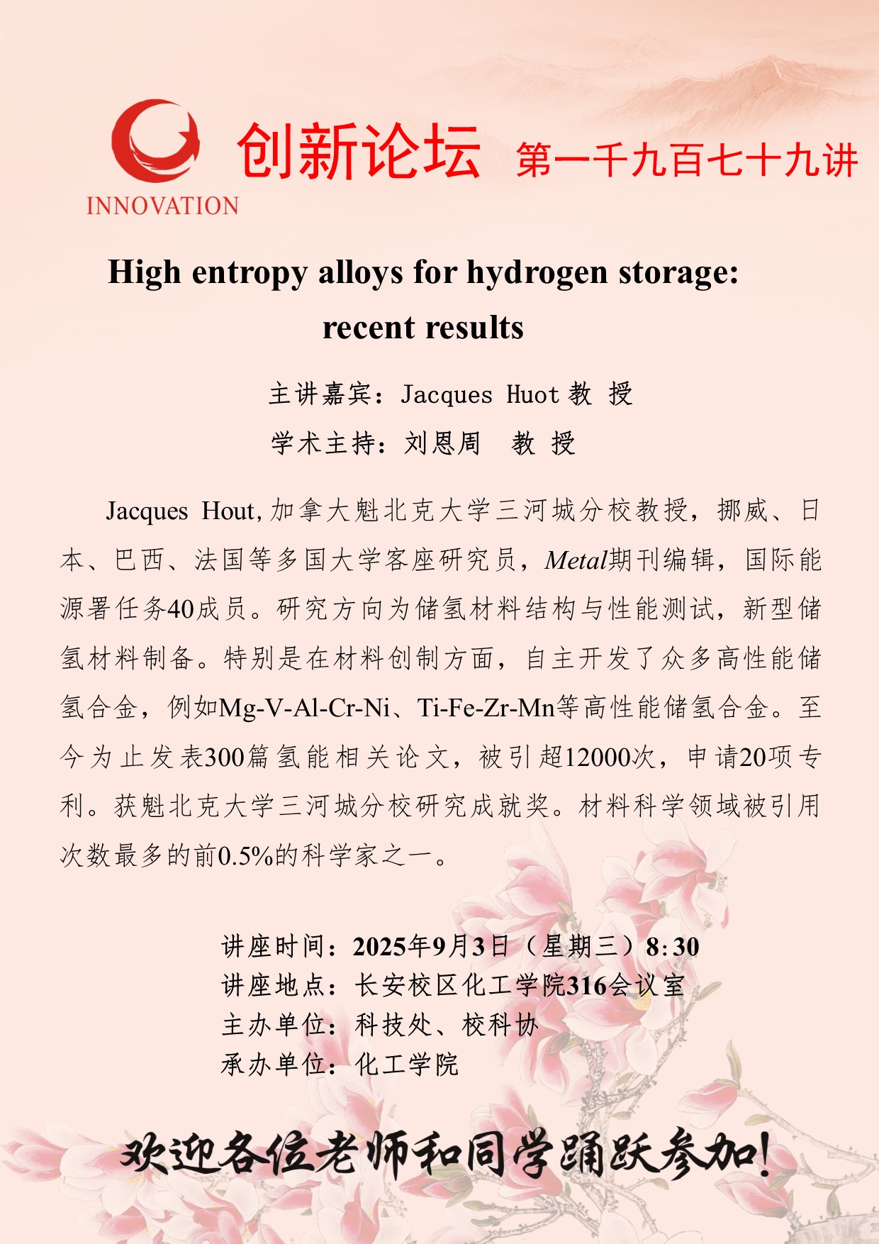 Jacques Huot 教授 古天乐代言太阳集团城网址创新论坛第一千九百七十九讲:High entropy alloys for hydrogen storage: recent results 讲座时间 2025年9月3日(星期三)8:30 讲座地点 长安校区化工学院316会议室 讲座人介绍 Jacques Huot 教授 讲座内容