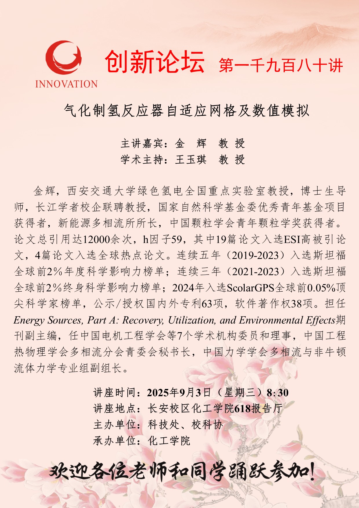 金辉 教授 古天乐代言太阳集团城网址创新论坛第一千九百八十讲:气化制氢反应器自适应网格及数值模拟 讲座时间 2025年9月3日(星期三)8:30 讲座地点 长安校区化工学院618报告厅 讲座人介绍 金辉 教授 讲座内容
