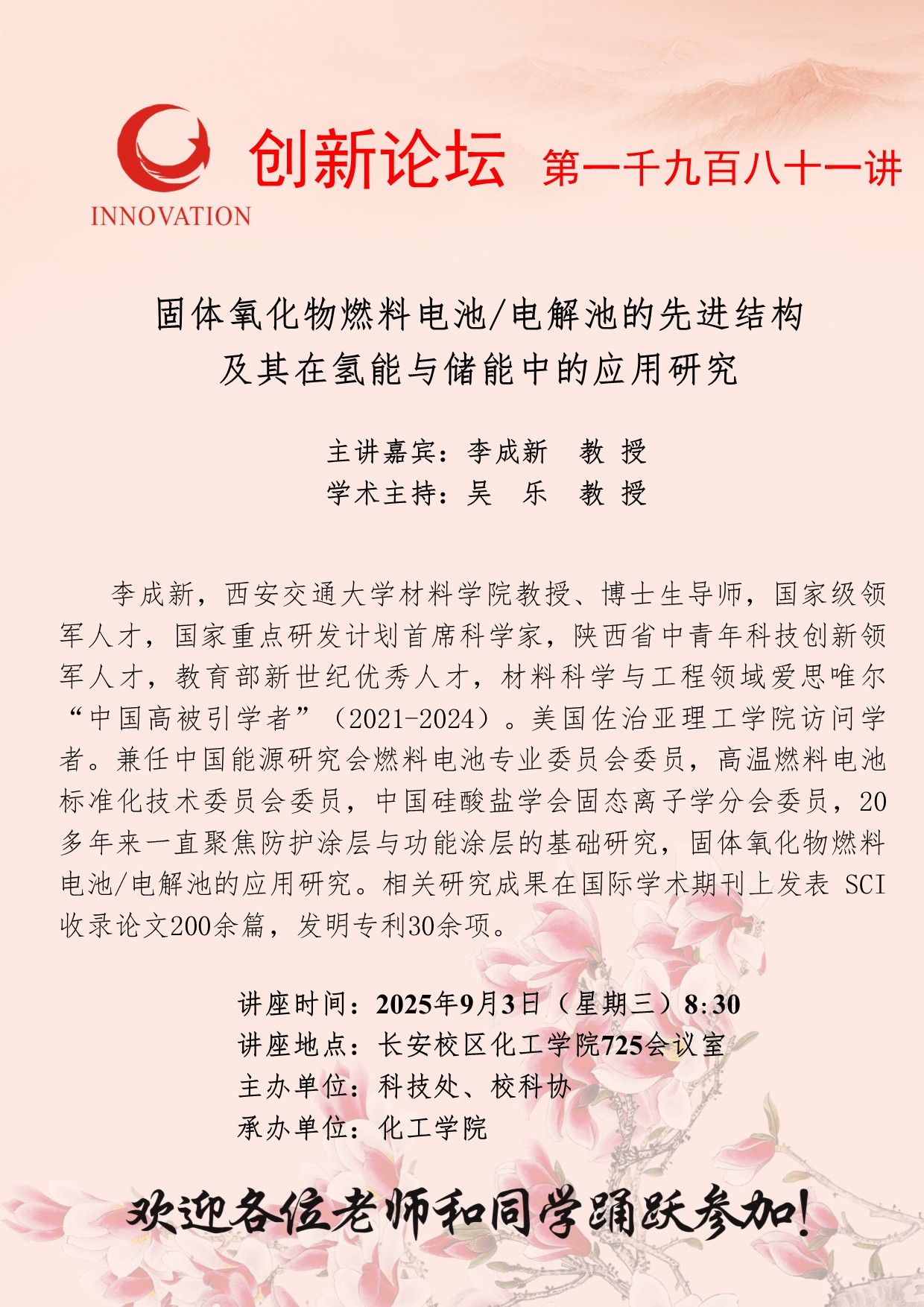 李成新 教授 古天乐代言太阳集团城网址创新论坛第一千九百八十一讲:固体氧化物燃料电池/电解池的先进结构及其在氢能与储能中的应用研究 讲座时间 2025年9月3日(星期三)8:30 讲座地点 长安校区化工学院725会议室 讲座人介绍 李成新 教授 讲座内容