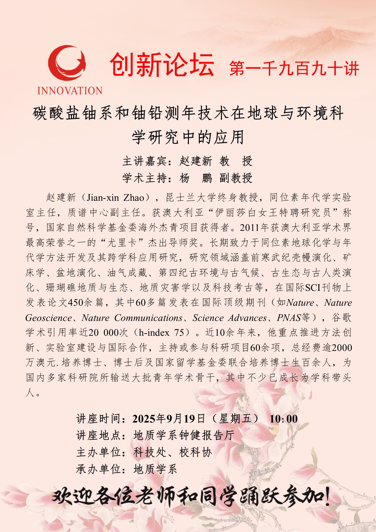 赵建新 教授 古天乐代言太阳集团城网址创新论坛第一千九百九十讲:碳酸盐铀系和铀铅测年技术在地球与环境科学研究中的应用 讲座时间 2025年9月19日(星期五) 10:00 讲座地点 地质学系钟健报告厅 讲座人介绍 赵建新 教授 讲座内容