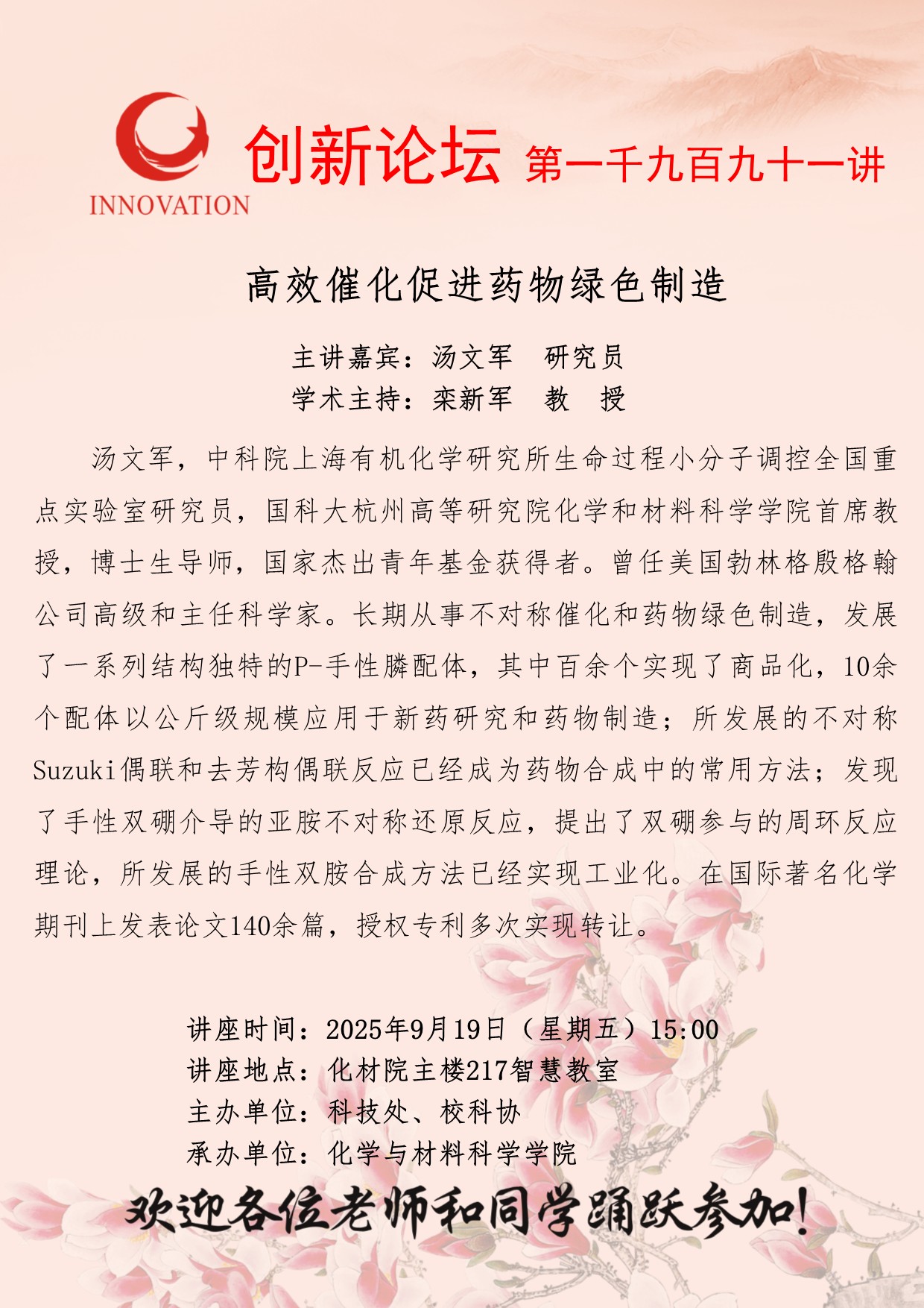 汤文军 研究员 古天乐代言太阳集团城网址创新论坛第一千九百九十一讲:高效催化促进药物绿色制造 讲座时间 2025年9月19日(星期五)15:00 讲座地点 化材院主楼217智慧教室 讲座人介绍 汤文军 研究员 讲座内容