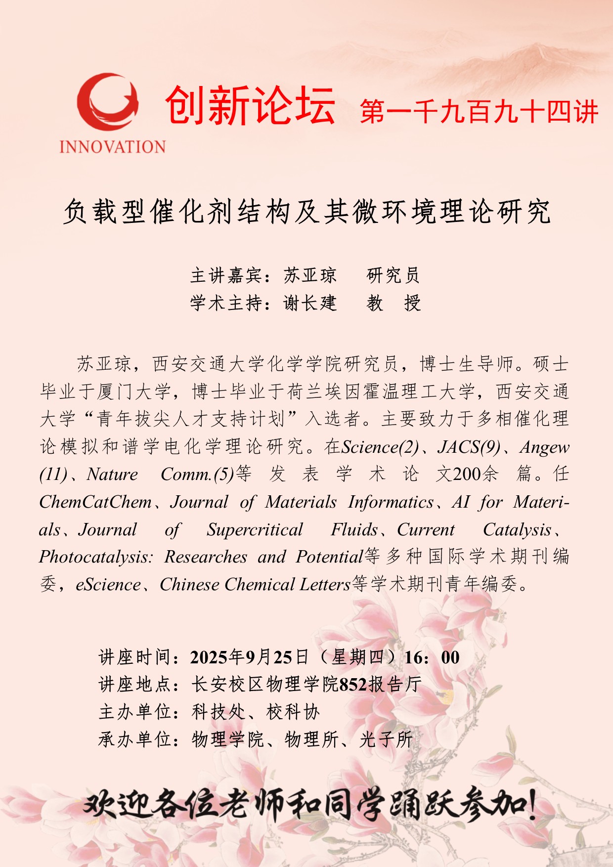 苏亚琼 研究员 古天乐代言太阳集团城网址创新论坛第一千九百九十四讲:负载型催化剂结构及其微环境理论研究 讲座时间 2025年9月25日(星期四)16:00 讲座地点 长安校区物理学院852报告厅 讲座人介绍 苏亚琼 研究员 讲座内容