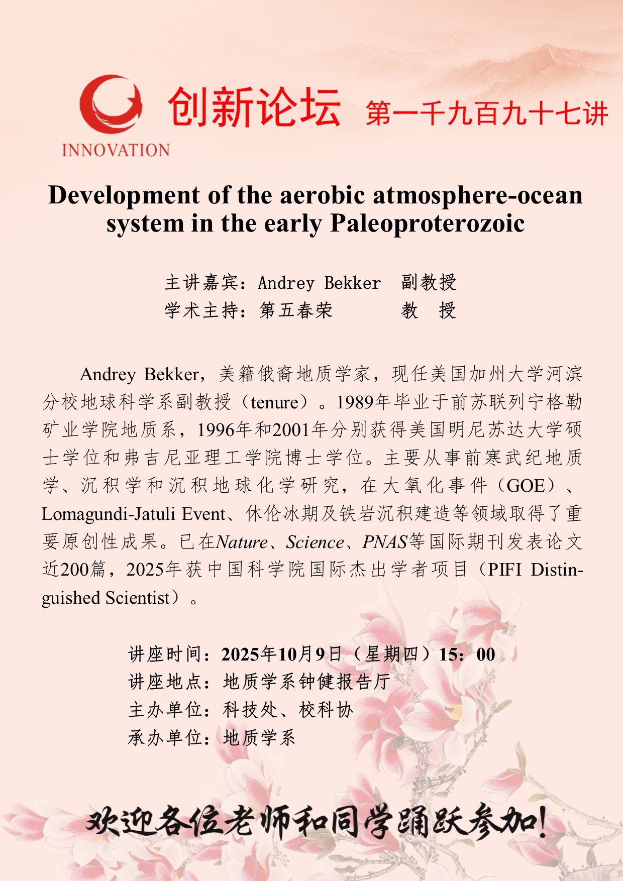 Andrey Bekker 副教授 古天乐代言太阳集团城网址创新论坛第一千九百九十七讲:Development of the aerobic atmosphere-ocean system in the early Paleoproterozoic 讲座时间 2025年10月9日(星期四)15:00 讲座地点 地质学系钟健报告厅 讲座人介绍 Andrey Bekker 副教授 讲座内容