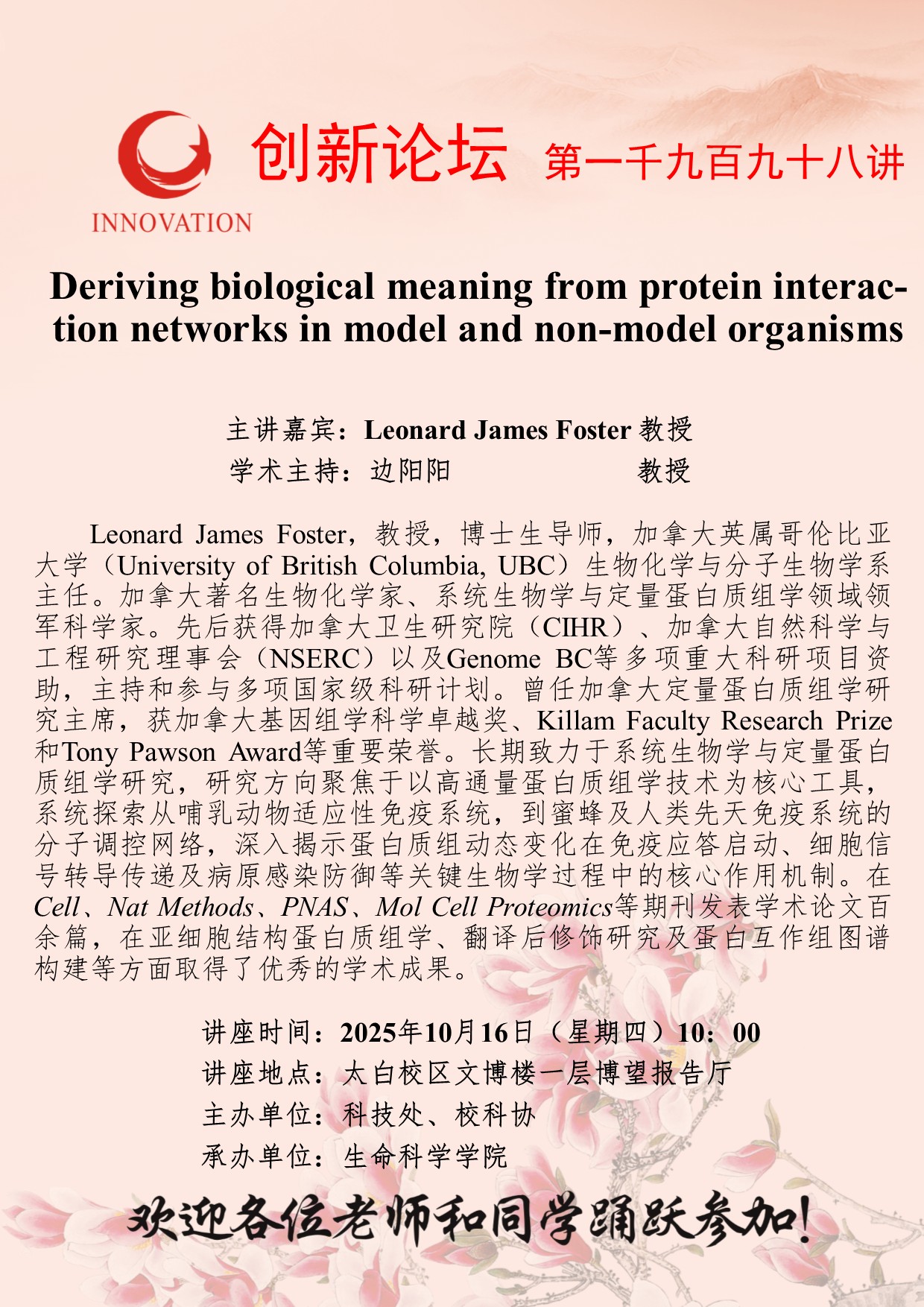 Leonard James Foster 教授 古天乐代言太阳集团城网址创新论坛第一千九百九十八讲:Deriving biological meaning from protein interaction networks in model and non-model organisms 讲座时间 2025年10月16日(星期四)10:00 讲座地点 太白校区文博楼一层博望报告厅 讲座人介绍 Leonard James Foster 教授 讲座内容