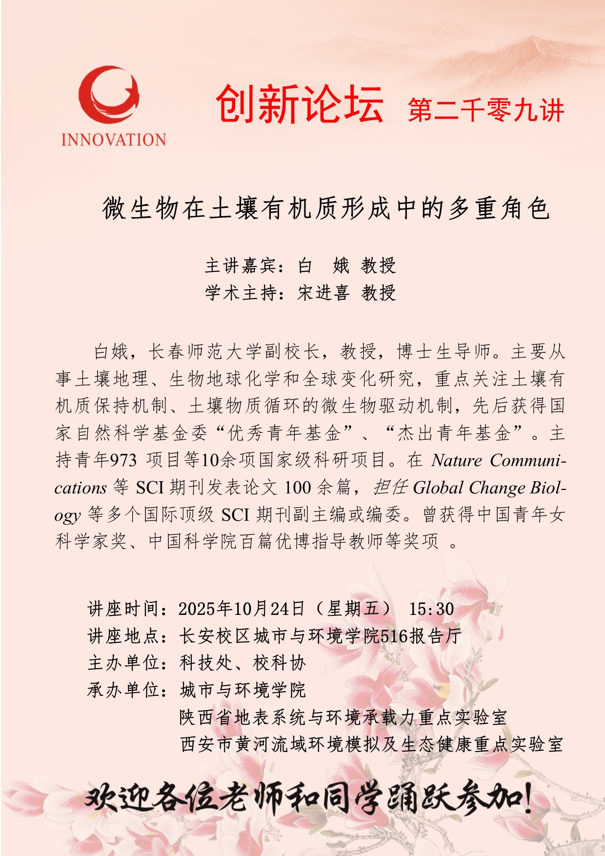 白娥 教授 古天乐代言太阳集团城网址创新论坛第二千零九讲:微生物在土壤有机质形成中的多重角色 讲座时间 2025年10月24日(星期五) 15:30 讲座地点 长安校区城市与环境学院516报告厅 讲座人介绍 白娥 教授 讲座内容