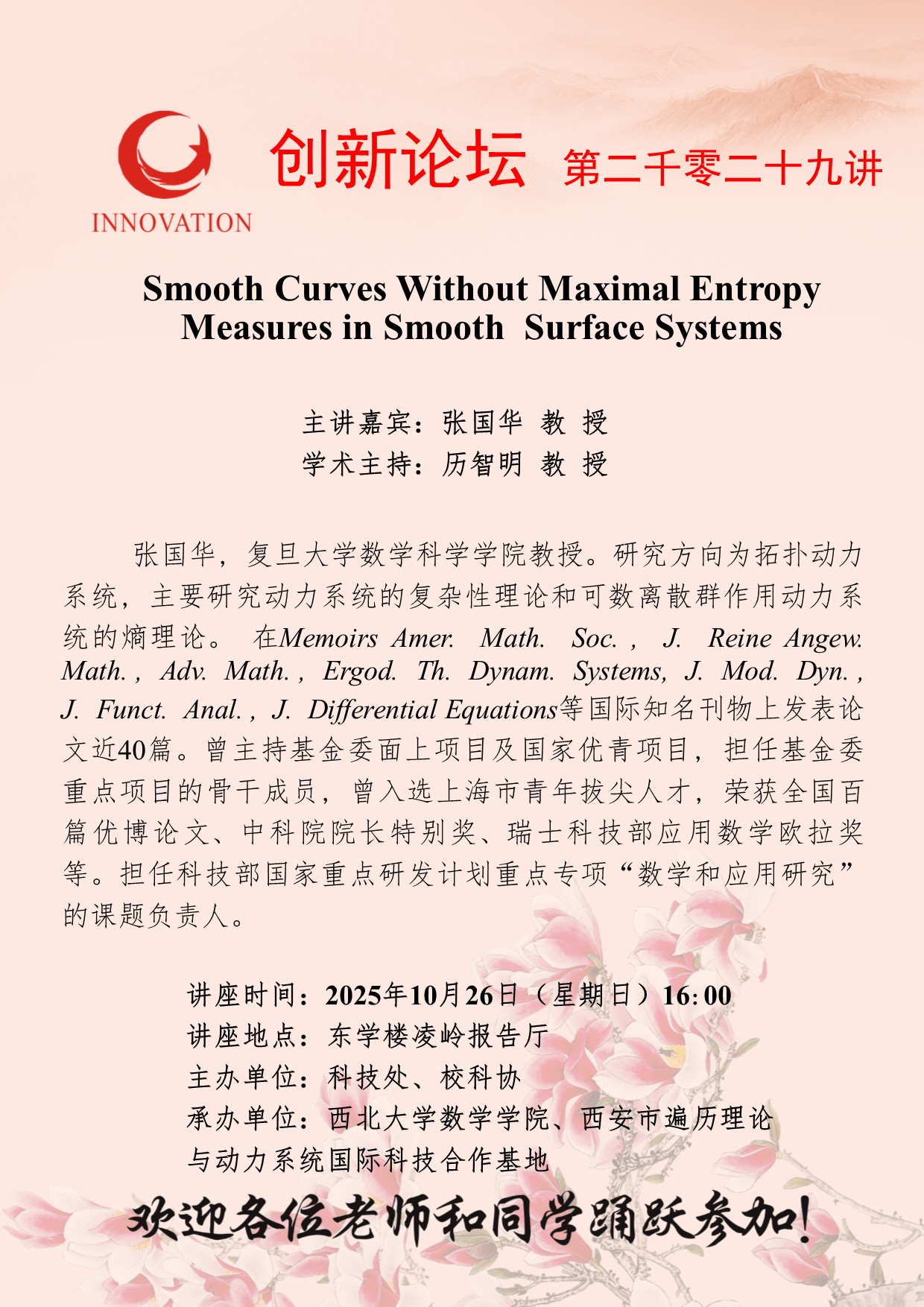 张国华 教 授 古天乐代言太阳集团城网址创新论坛第二千零二十九讲:Smooth Curves Without Maximal Entropy Measures in Smooth Surface Systems 讲座时间 2025年10月26日(星期日)16:00 讲座地点 东学楼凌岭报告厅 讲座人介绍 张国华 教 授 讲座内容