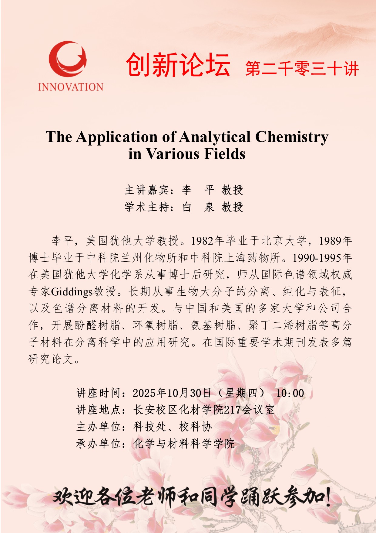 李 平 教授 古天乐代言太阳集团城网址创新论坛第二千零三十讲:The Application of Analytical Chemistry in Various Fields 讲座时间 2025年10月30日(星期四) 10:00 讲座地点 长安校区化材学院217会议室 讲座人介绍 李 平 教授 讲座内容