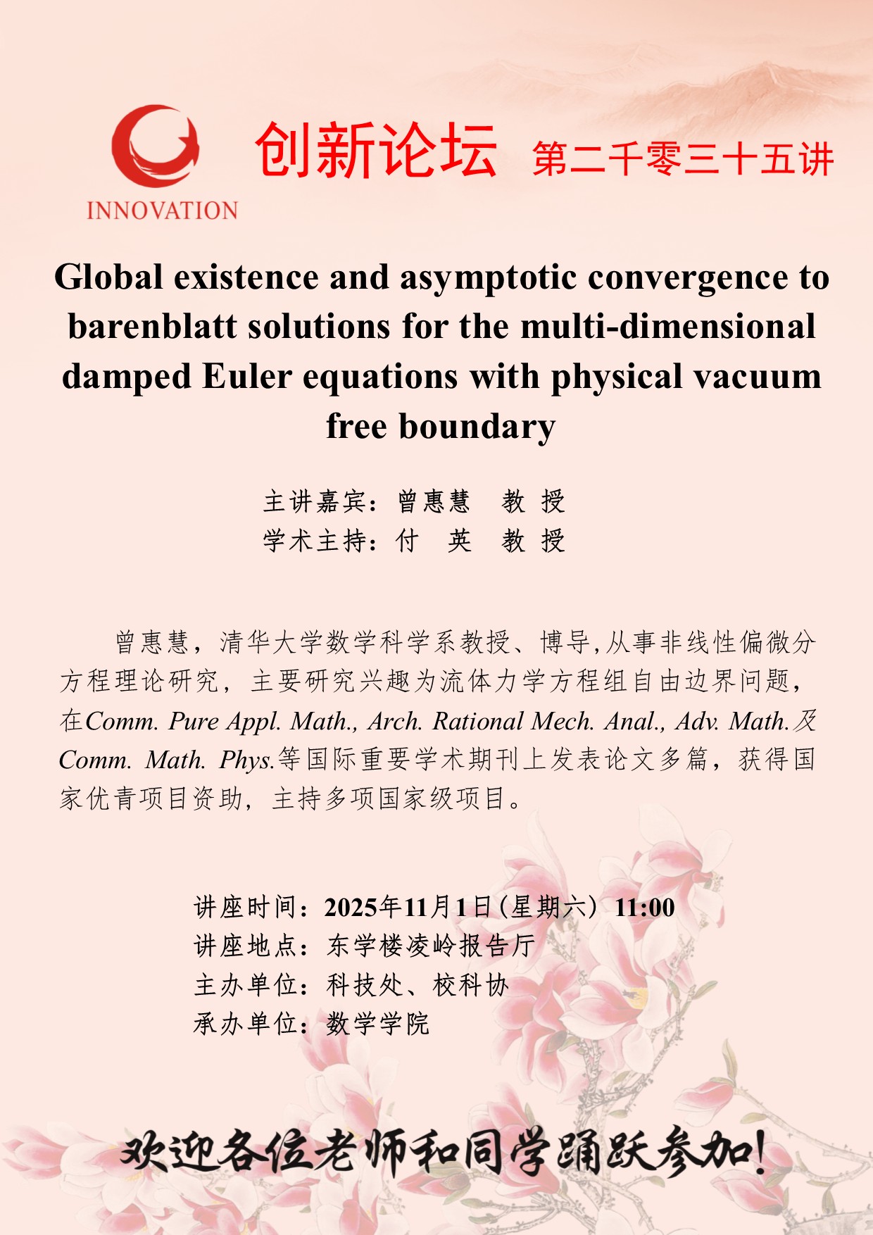 曾惠慧 教 授 古天乐代言太阳集团城网址创新论坛第二千零三十五讲:Global existence and asymptotic convergence to barenblatt solutions for the multi-dimensional damped Euler equations with physical vacuum free boundary 讲座时间 2025年11月1日(星期六) 11:00 讲座地点 东学楼凌岭报告厅 讲座人介绍 曾惠慧 教 授 讲座内容