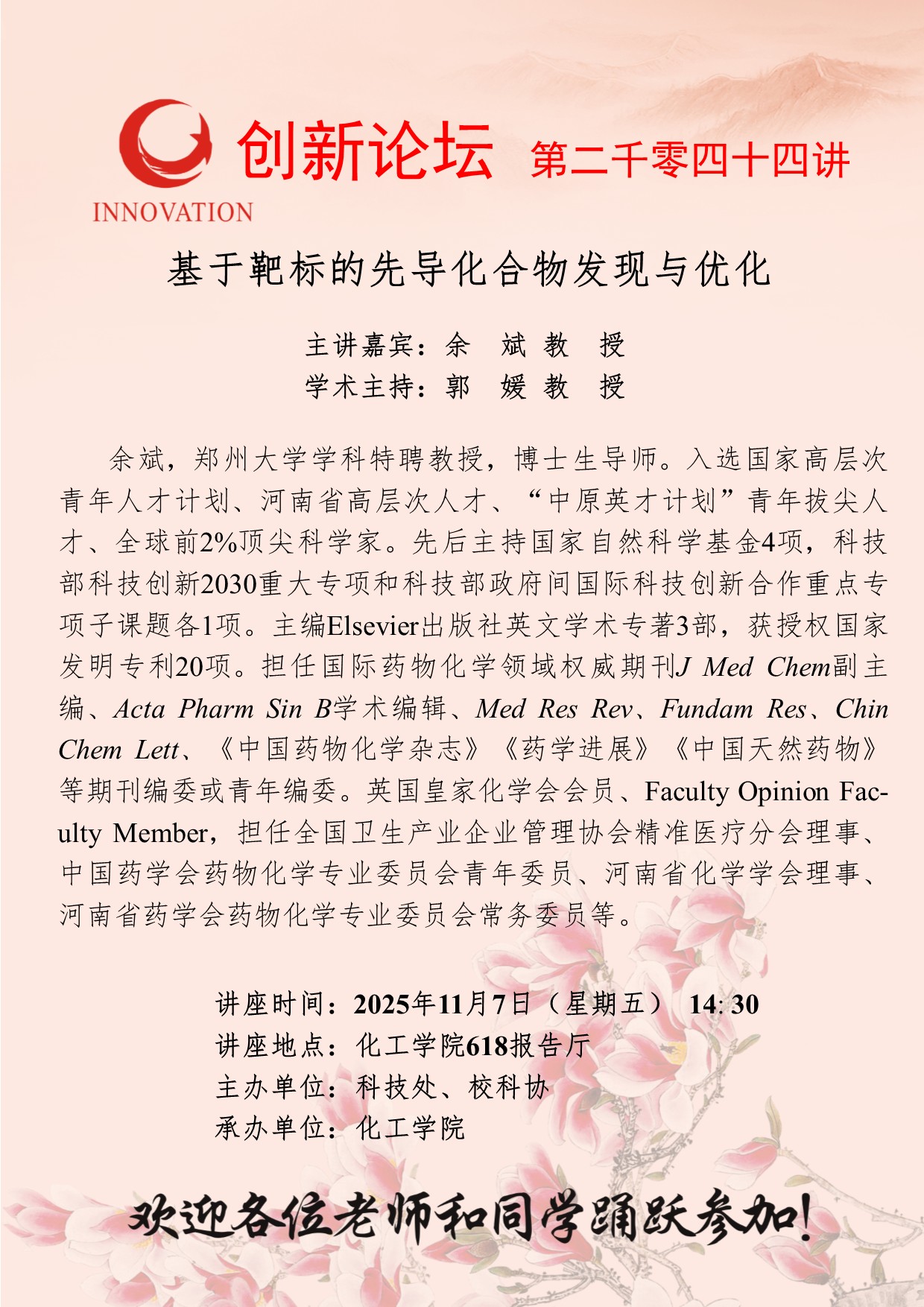 余斌 教授 古天乐代言太阳集团城网址创新论坛第二千零四十四讲:基于靶标的先导化合物发现与优化 讲座时间 2025年11月7日(星期五) 14: 30 讲座地点 化工学院618报告厅 讲座人介绍 余斌 教授 讲座内容