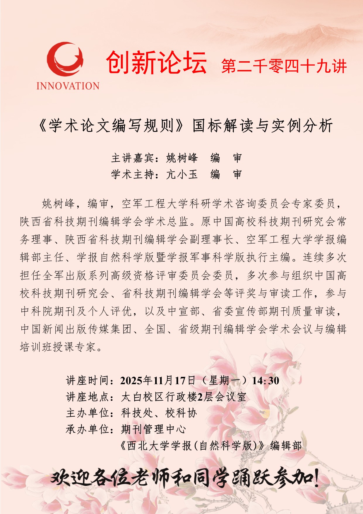姚树峰 编审 古天乐代言太阳集团城网址创新论坛第二千零四十九讲:《学术论文编写规则》国标解读与实例分析 讲座时间 2025年11月17日(星期一)14:30 讲座地点 太白校区行政楼2层会议室 讲座人介绍 姚树峰 编审 讲座内容