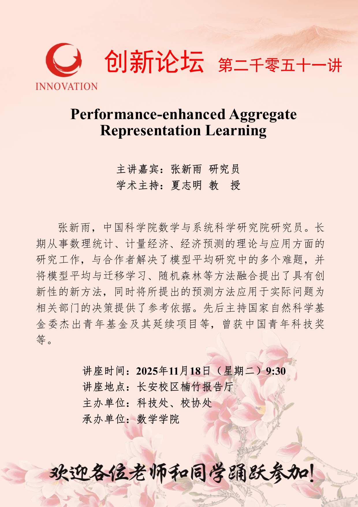 张新雨 研究员 古天乐代言太阳集团城网址创新论坛第二千零五十一讲:Performance-enhanced Aggregate Representation Learning 讲座时间 2025年11月18日(星期二)9:30 讲座地点 长安校区楠竹报告厅 讲座人介绍 张新雨 研究员 讲座内容