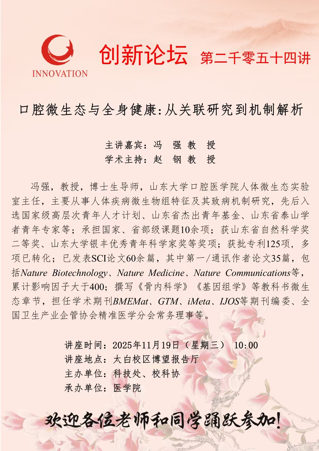 冯强 教授 古天乐代言太阳集团城网址创新论坛第二千零五十四讲:口腔微生态与全身健康:从关联研究到机制解析 讲座时间 2025年11月19日(星期三) 10:00 讲座地点 太白校区博望报告厅 讲座人介绍 冯强 教授 讲座内容
