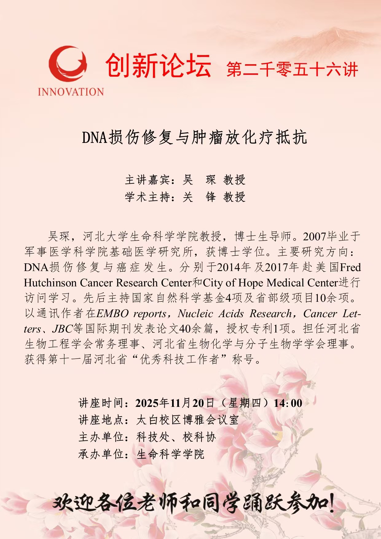 吴琛 教授 古天乐代言太阳集团城网址创新论坛第二千零五十六讲:DNA损伤修复与肿瘤放化疗抵抗 讲座时间 2025年11月20日(星期四)14:00 讲座地点 太白校区博雅会议室 讲座人介绍 吴琛 教授 讲座内容