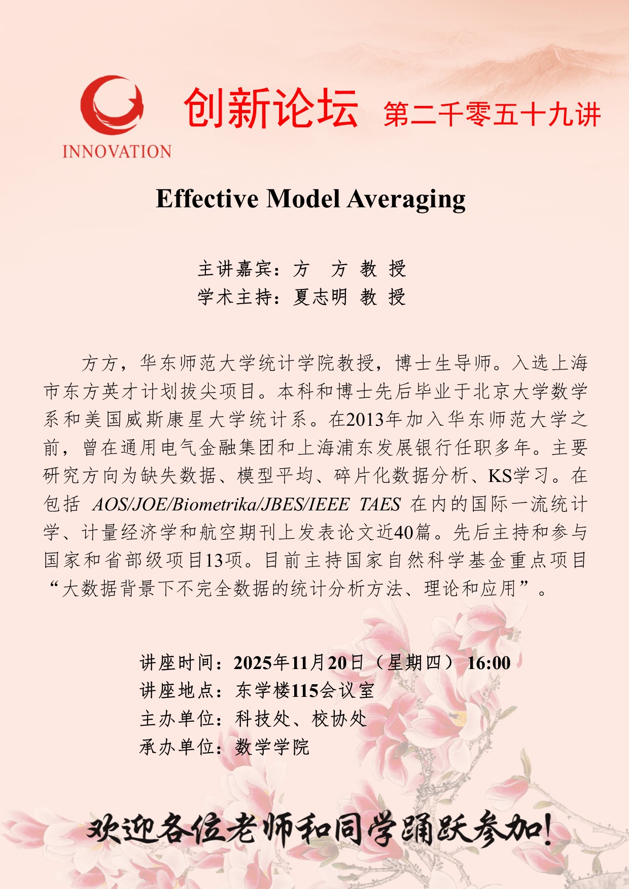 方方 教授 古天乐代言太阳集团城网址创新论坛第二千零五十九讲:Effective Model Averaging 讲座时间 2025年11月20日(星期四) 16:00 讲座地点 东学楼115会议室 讲座人介绍 方方 教授 讲座内容