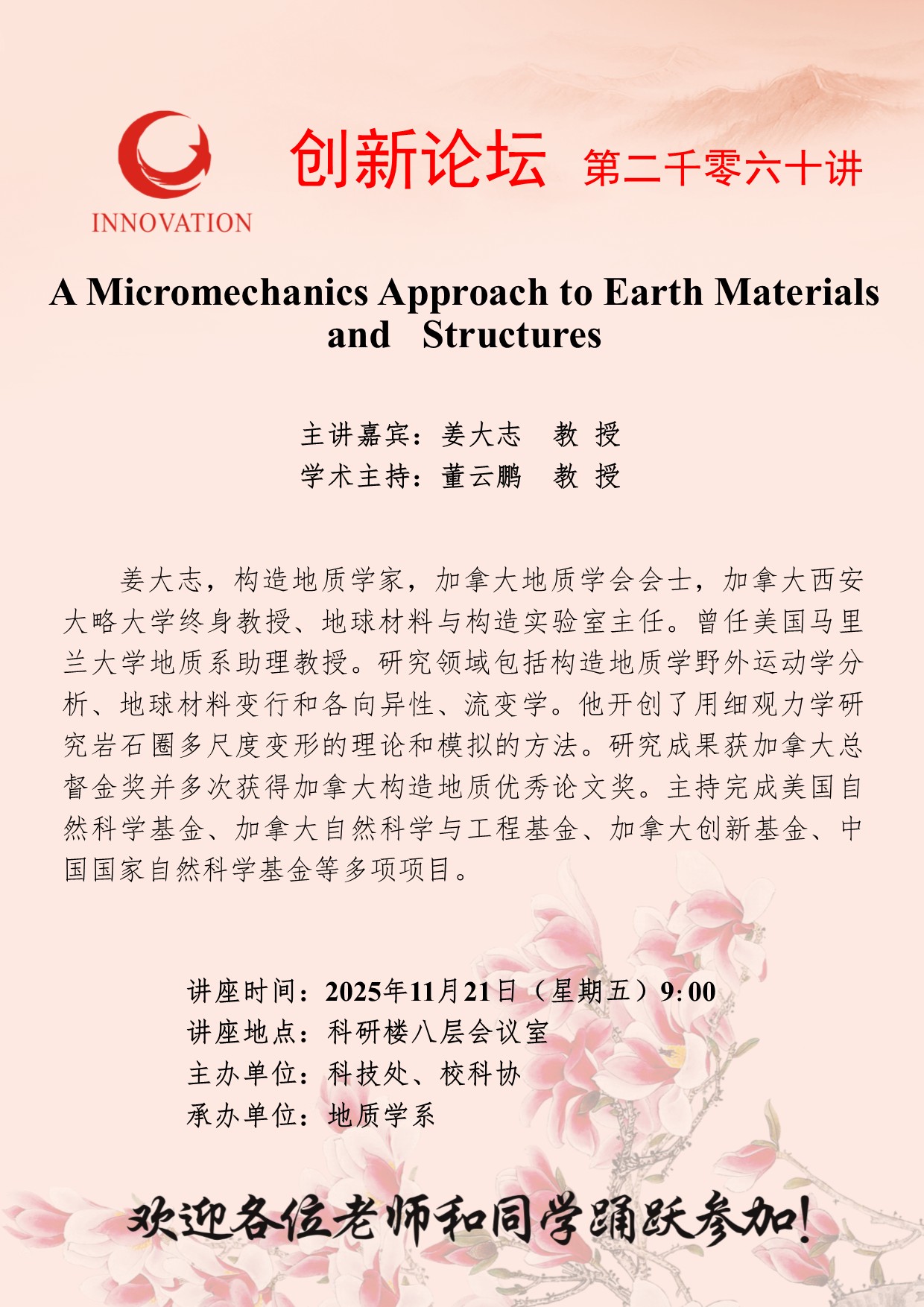 姜大志 教授 古天乐代言太阳集团城网址创新论坛第二千零六十讲:A Micromechanics Approach to Earth Materials and Structures 讲座时间 2025年11月21日(星期五)9:00 讲座地点 科研楼八层会议室 讲座人介绍 姜大志 教授 讲座内容