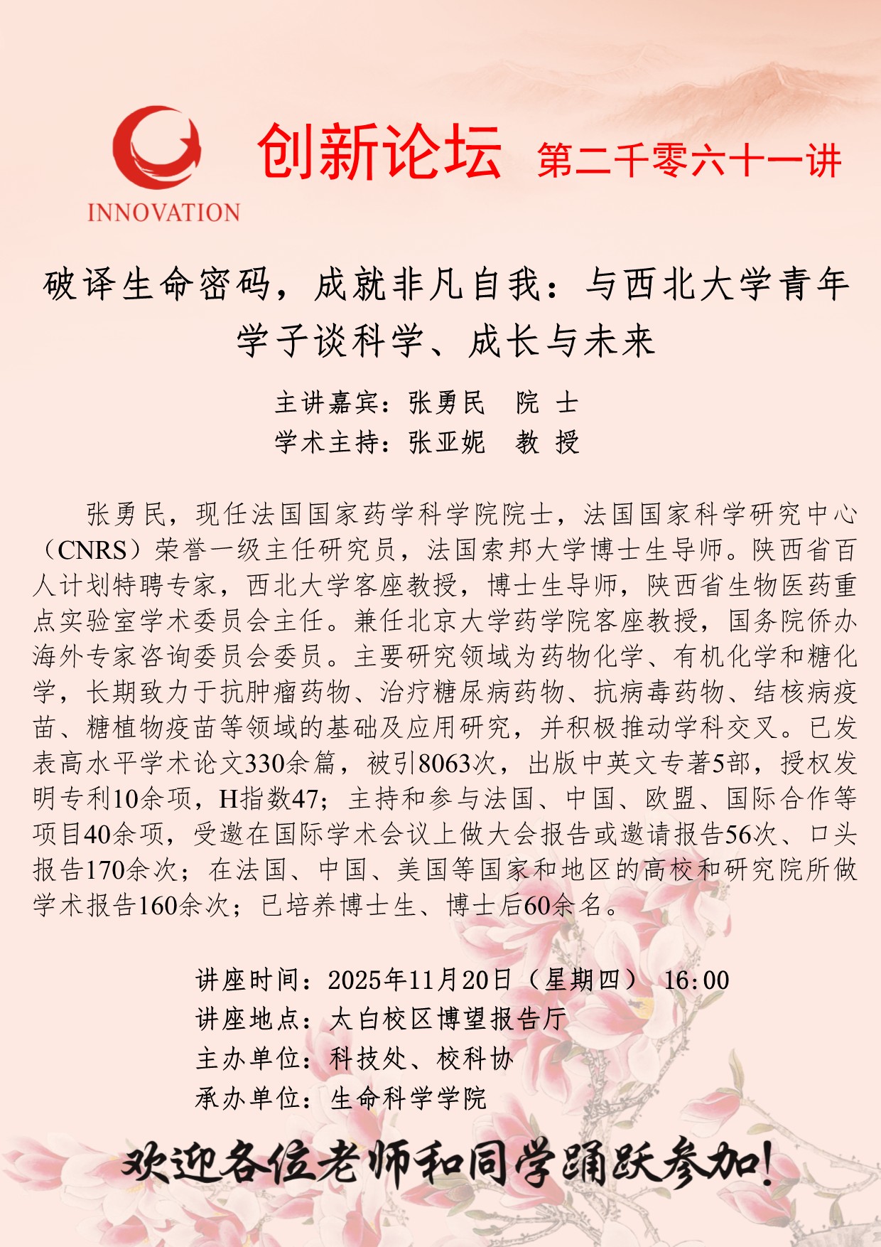 张勇民 院士 古天乐代言太阳集团城网址创新论坛第二千零六十一讲:破译生命密码,成就非凡自我:与古天乐代言太阳集团城网址青年学子谈科学、成长与未来 讲座时间 2025年11月20日(星期四) 16:00 讲座地点 太白校区博望报告厅 讲座人介绍 张勇民 院士 讲座内容