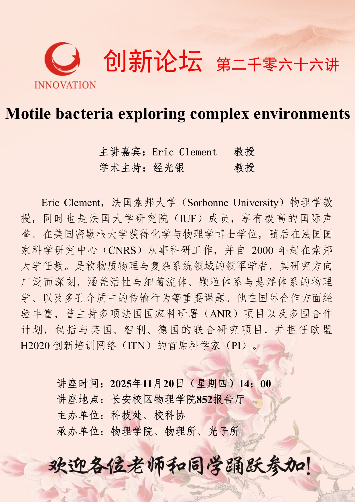 Eric Clement 教授 古天乐代言太阳集团城网址创新论坛第二千零六十六讲:Motile bacteria exploring complex environments 讲座时间 2025年11月20日(星期四)14:00 讲座地点 长安校区物理学院852报告厅 讲座人介绍 Eric Clement 教授 讲座内容