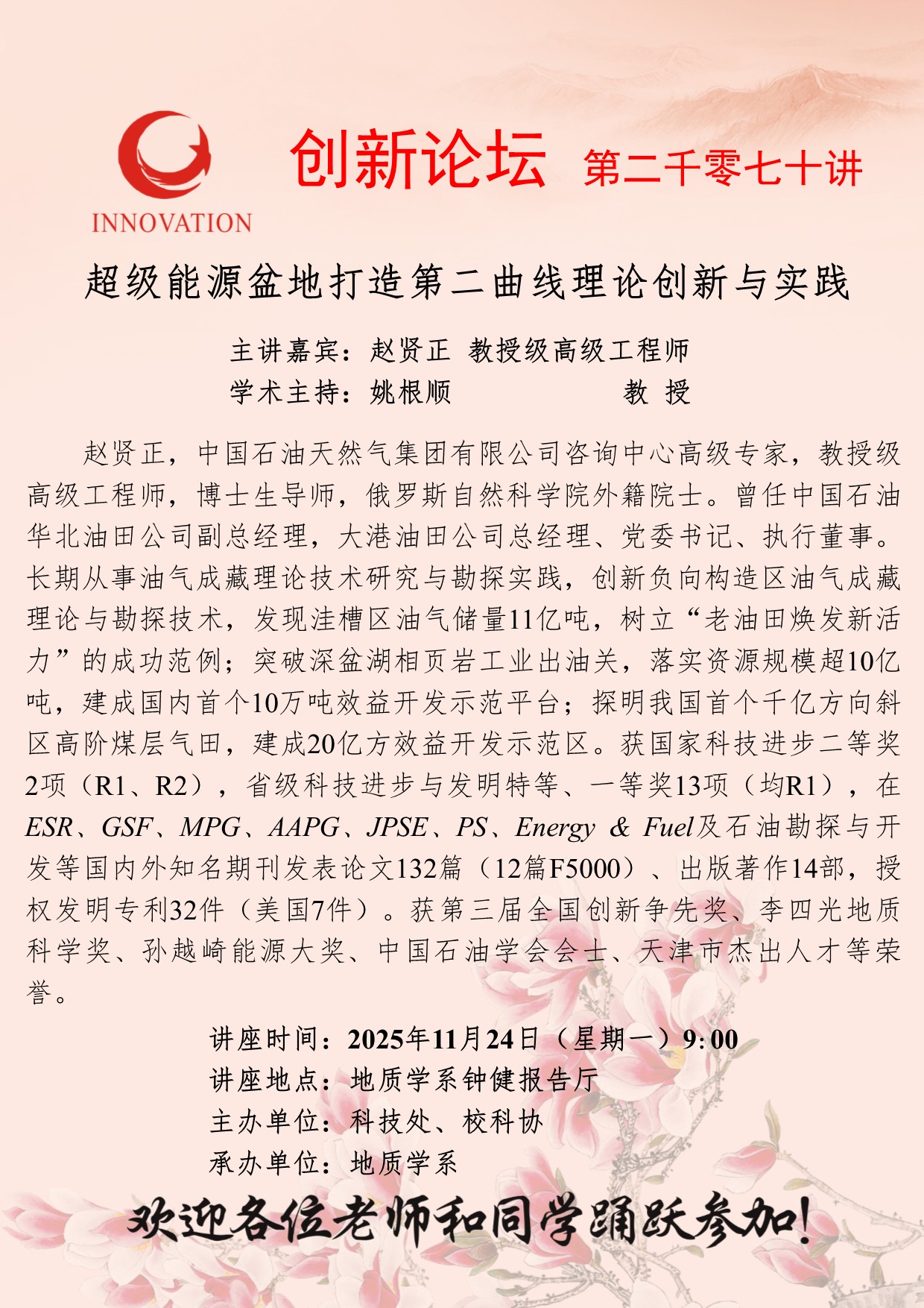 赵贤正 教授级高级工程师 古天乐代言太阳集团城网址创新论坛第二千零七十讲:超级能源盆地打造第二曲线理论创新与实践 讲座时间 2025年11月24日(星期一)9:00 讲座地点 地质学系钟健报告厅 讲座人介绍 赵贤正 教授级高级工程师 讲座内容