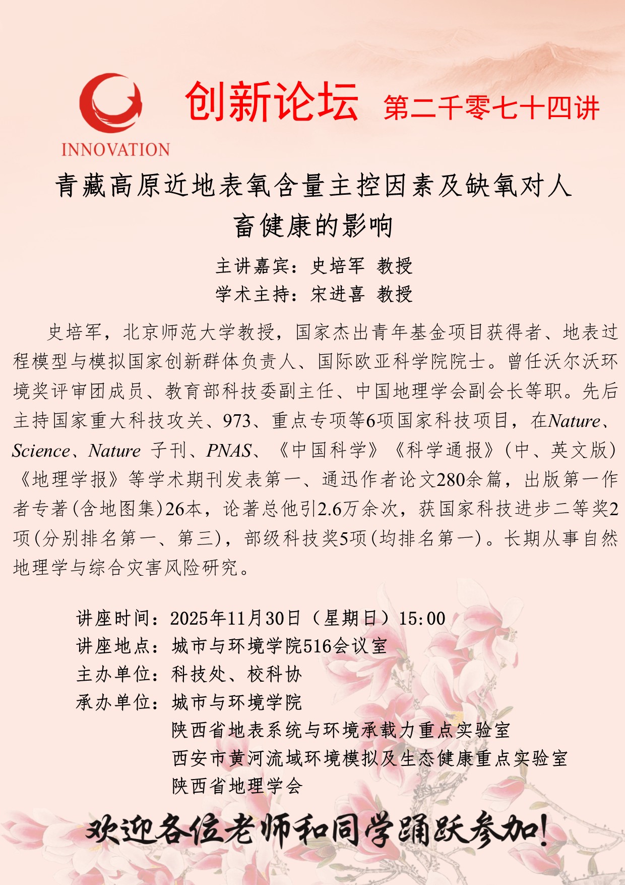 史培军 教授 古天乐代言太阳集团城网址创新论坛第二千零七十四讲:青藏高原近地表氧含量主控因素及缺氧对人畜健康的影响 讲座时间 2025年11月30日(星期日)15:00 讲座地点 城市与环境学院516会议室 讲座人介绍 史培军 教授 讲座内容