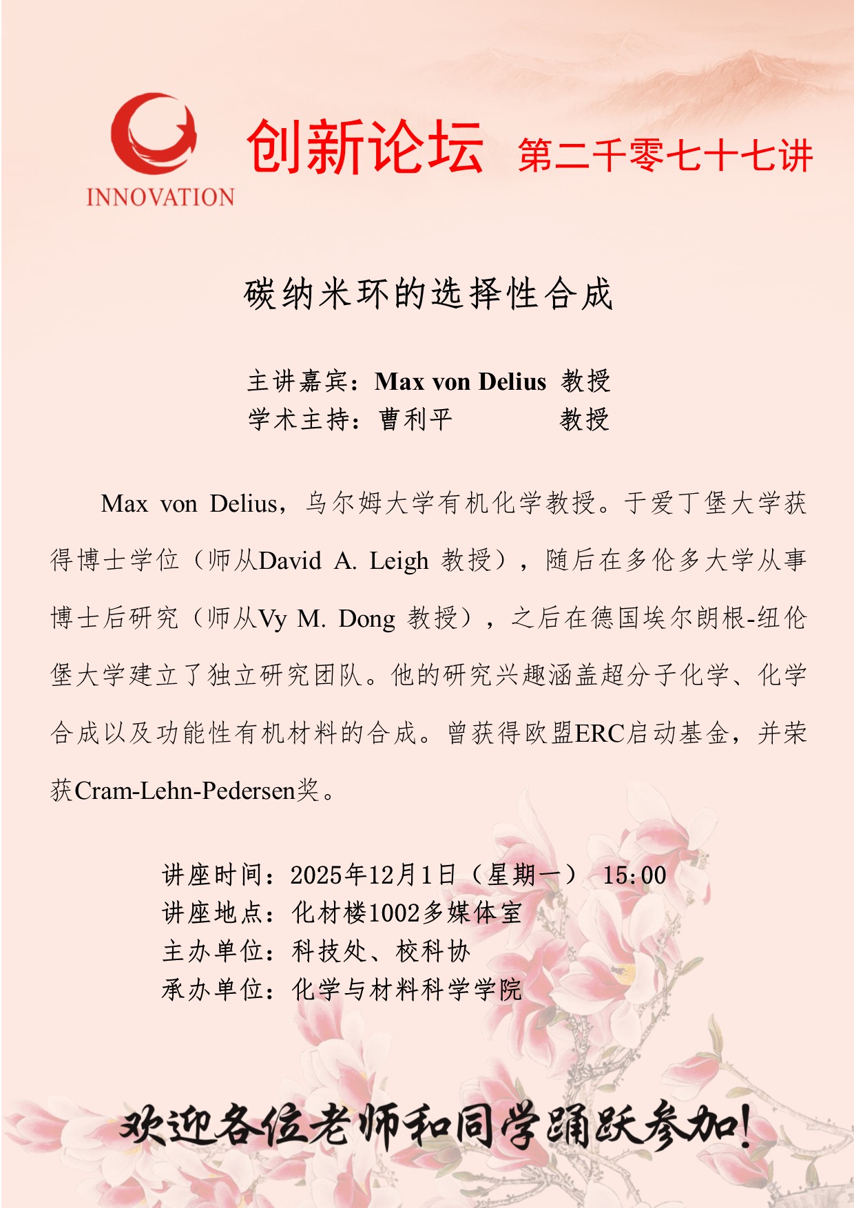 Max von Delius 教授 古天乐代言太阳集团城网址创新论坛第二千零七十七讲:碳纳米环的选择性合成 讲座时间 2025年12月1日(星期一) 15:00 讲座地点 化材楼1002多媒体室 讲座人介绍 Max von Delius 教授 讲座内容