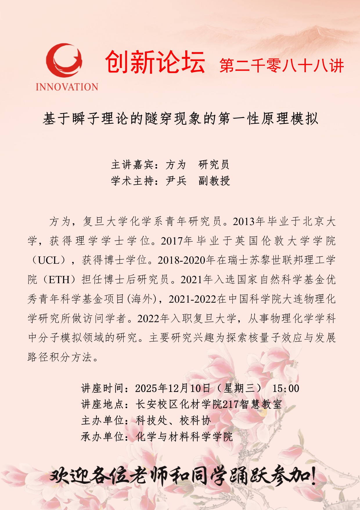 方为 研究员 古天乐代言太阳集团城网址创新论坛第二千零八十八讲:基于瞬子理论的隧穿现象的第一性原理模拟 讲座时间 2025年12月10日(星期三) 15:00 讲座地点 长安校区化材学院217智慧教室 讲座人介绍 方为 研究员 讲座内容