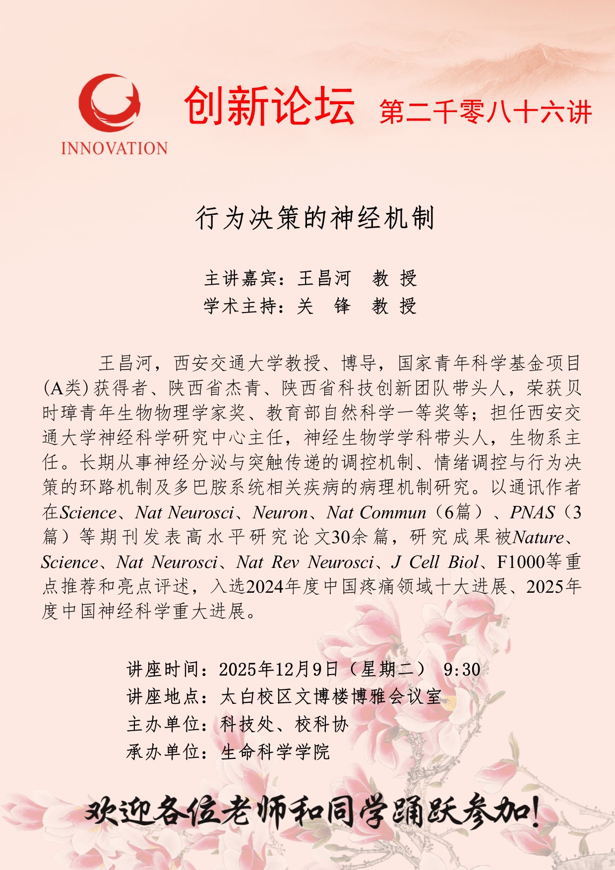 王昌河 教授 古天乐代言太阳集团城网址创新论坛第二千零八十六讲:行为决策的神经机制 讲座时间 2025年12月9日(星期二) 9:30 讲座地点 太白校区文博楼博雅会议室 讲座人介绍 王昌河 教授 讲座内容