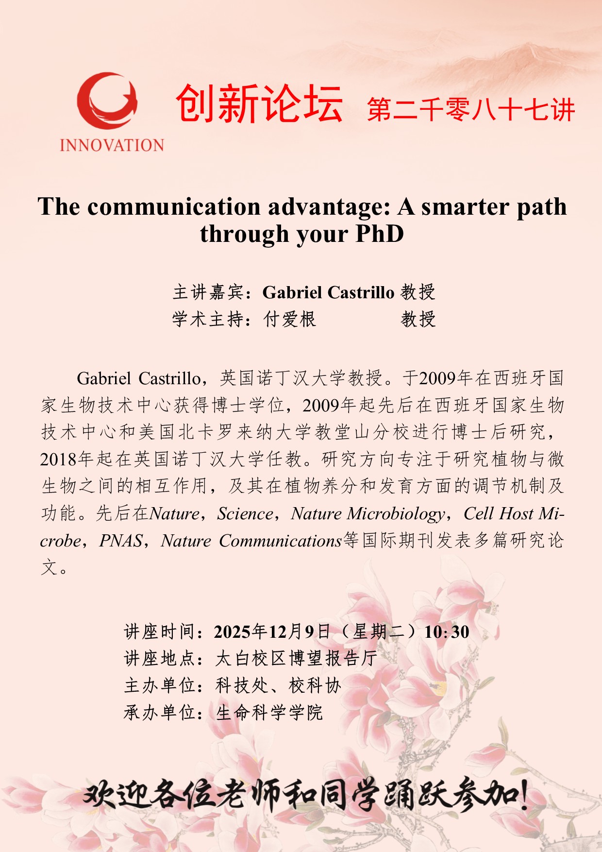 Gabriel Castrillo 教授 古天乐代言太阳集团城网址创新论坛第二千零八十七讲:The communication advantage: A smarter path through your PhD 讲座时间 2025年12月9日(星期二)10:30 讲座地点 太白校区博望报告厅 讲座人介绍 Gabriel Castrillo 教授 讲座内容